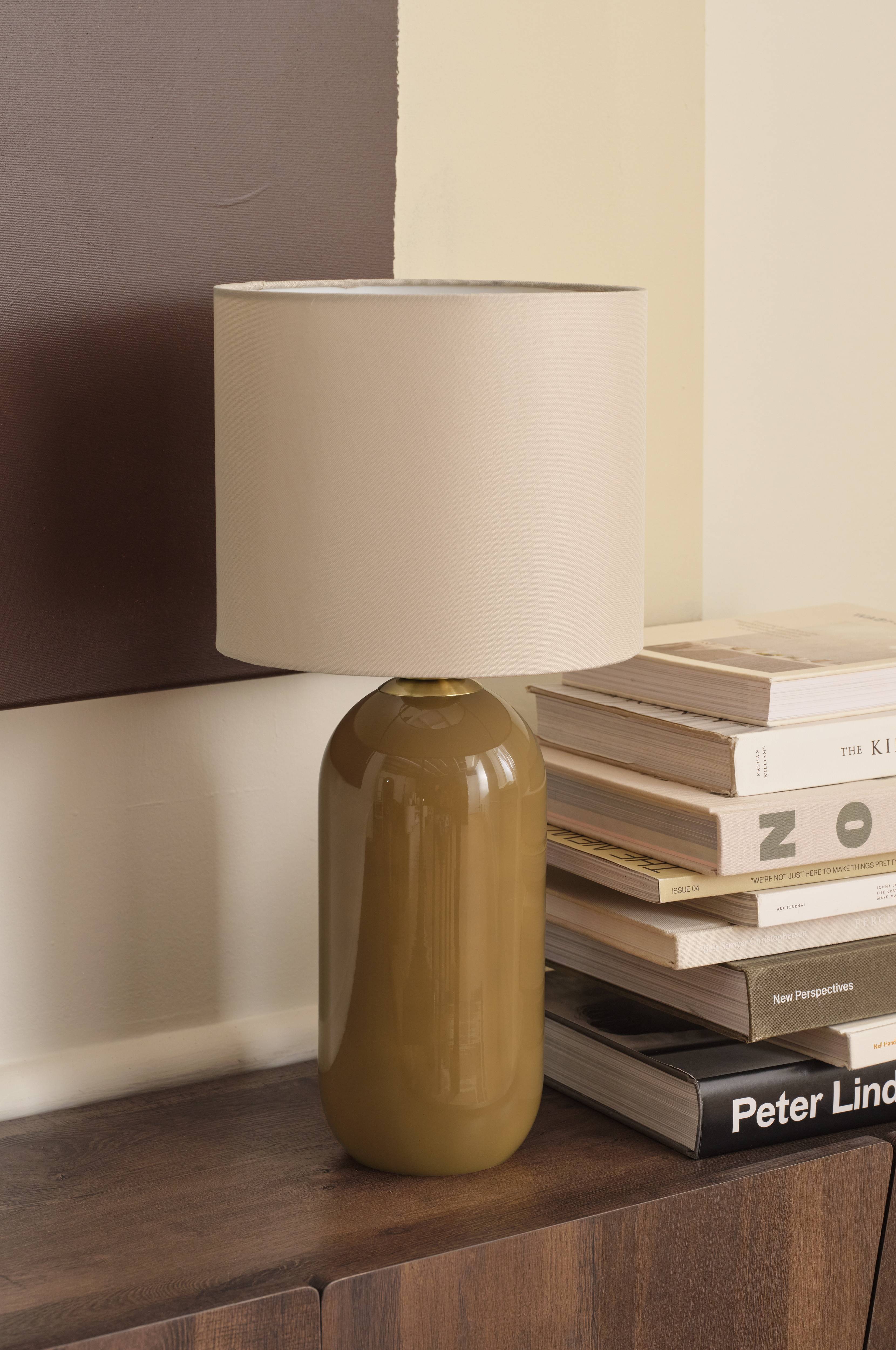 • Lampefod i glas• Skærm i hørstof• Tekstilsnor med kontakt• Pære medfølger ikke