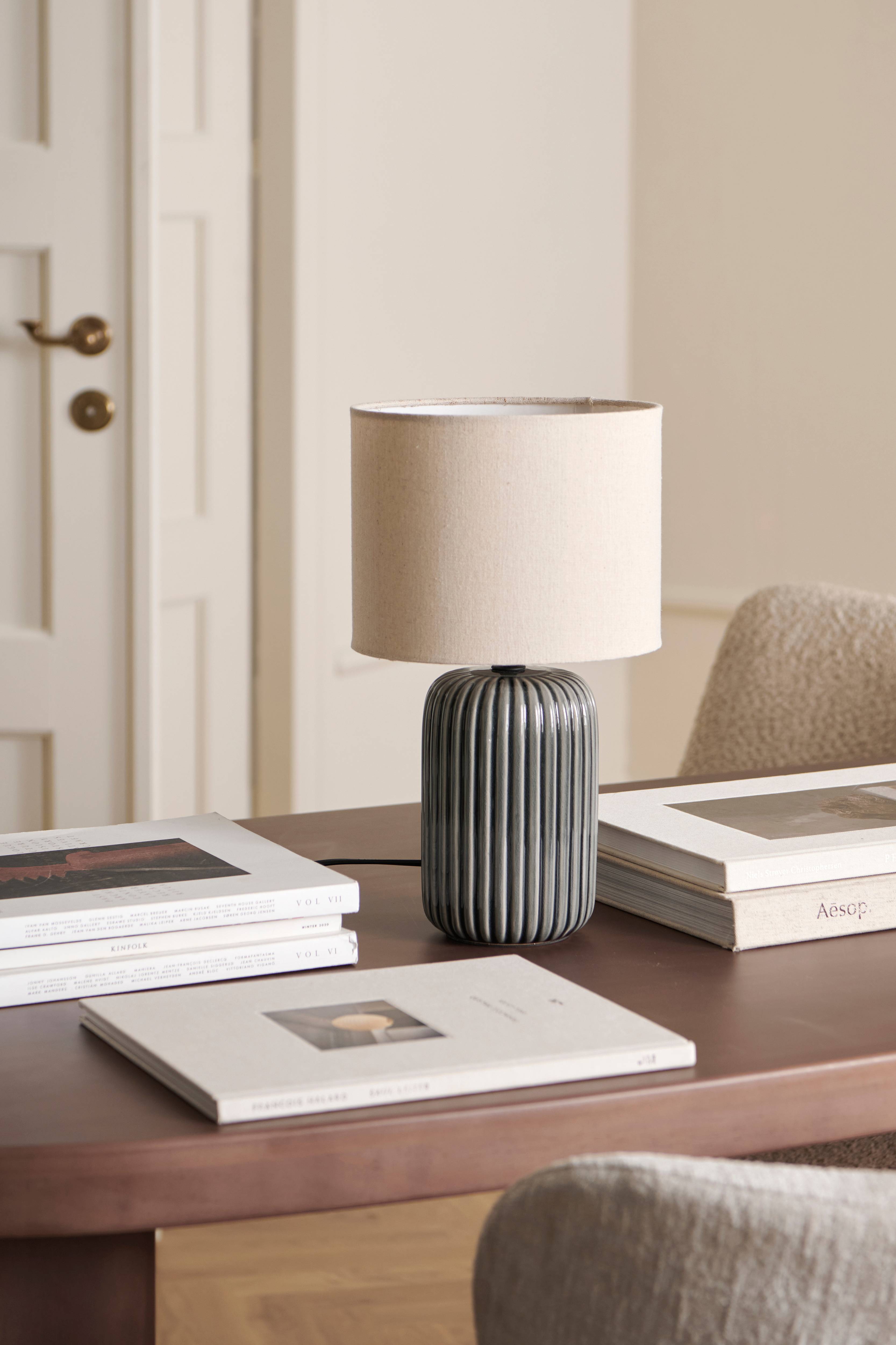 Bordlampe med fod af glaseret keramik med rillet struktur. Skærm af bomuldstekstil. Plastledning med strømafbryder. Skærmens mål: Diameter 20 cm, højde 16 cm. Lampefodens mål: Diameter 11 cm, højde 19 cm. Pære medfølger ikke.
