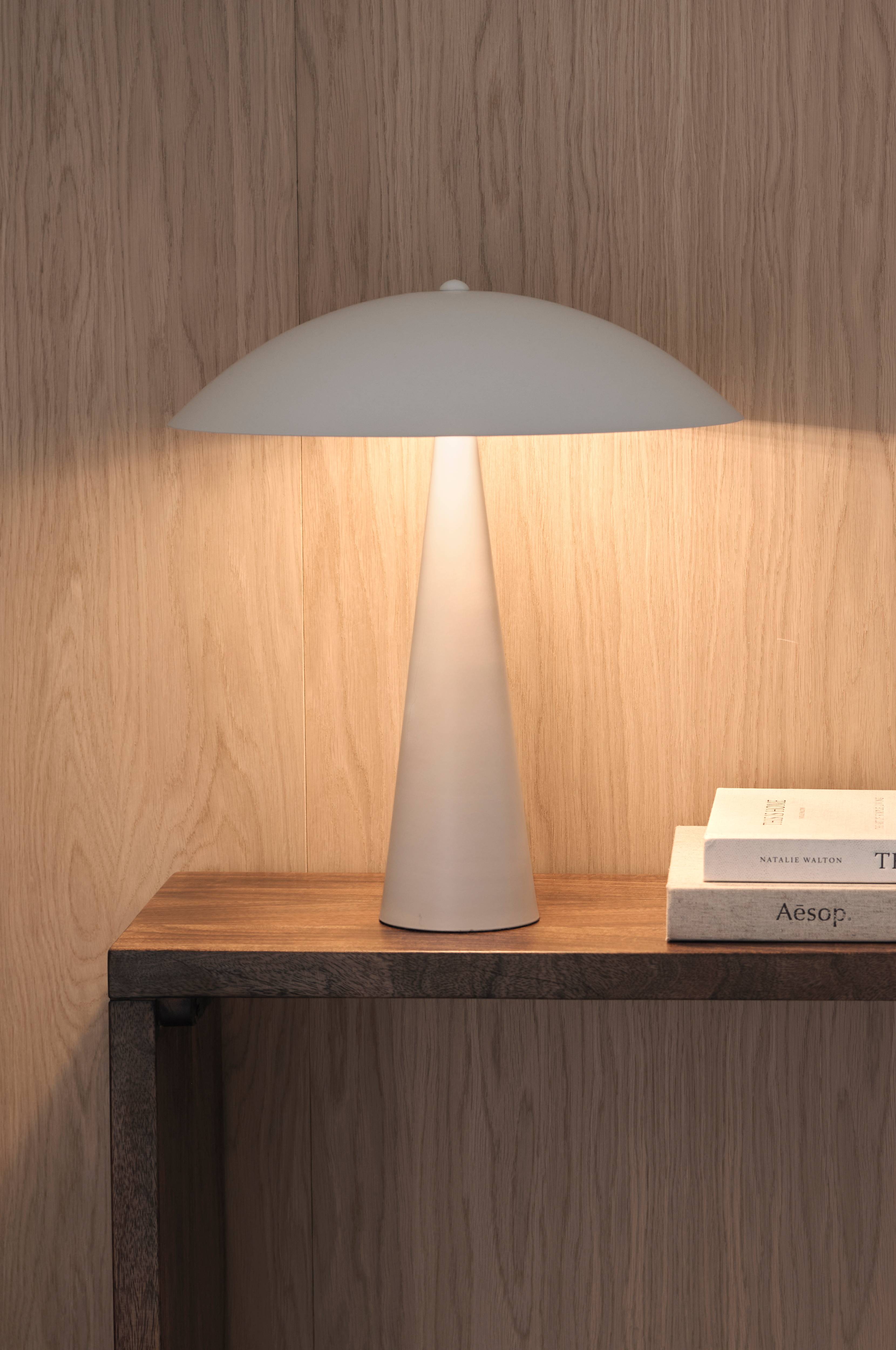 Bordlampe af metal.Skærmens mål: Diameter 35 cm, højde 8 cm.Lampefodens mål: Diameter bund 10 cm, højde 30 cm. Sort ledning med strømafbryder. Pære medfølger ikke.