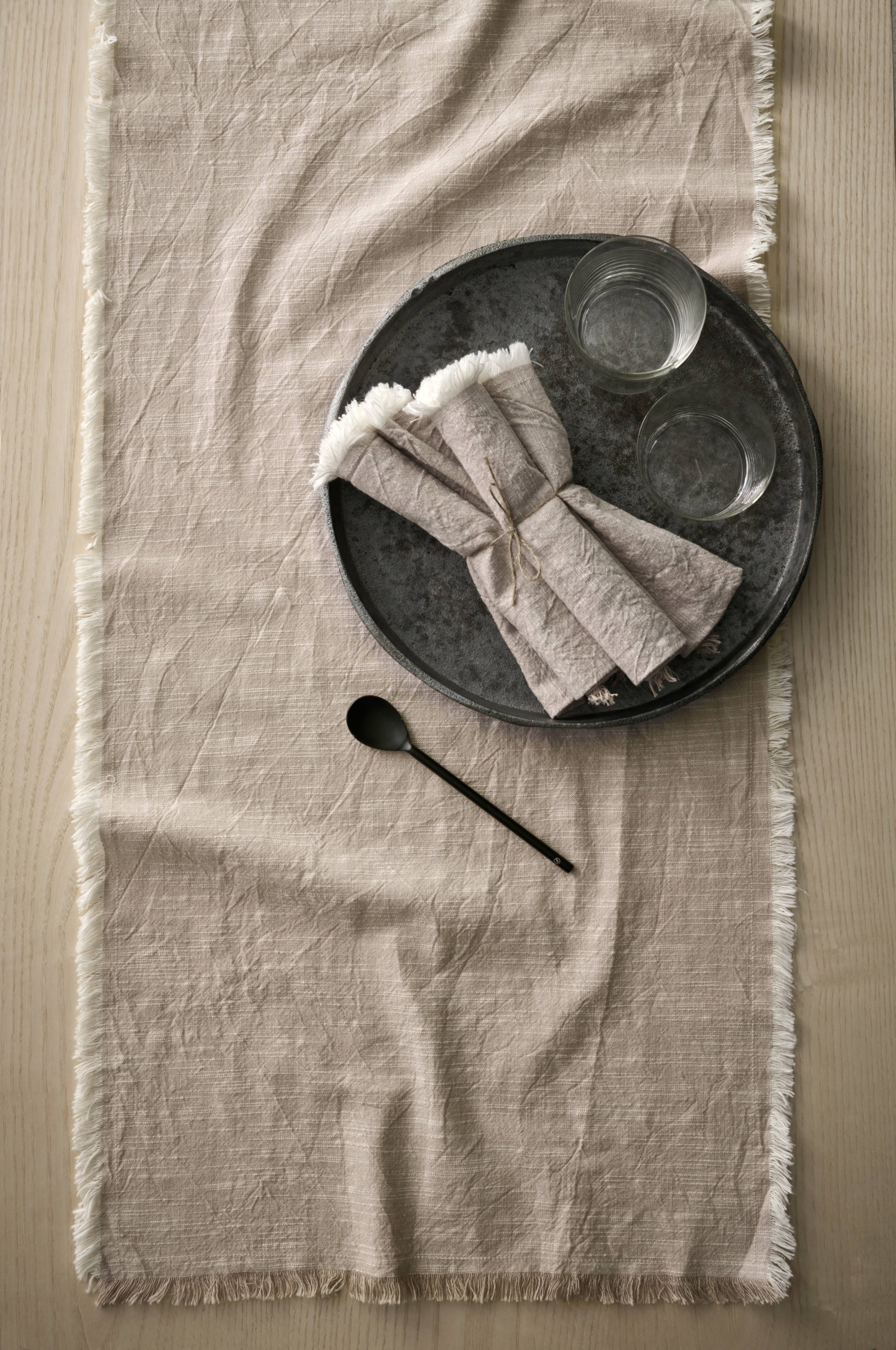 Bordløber i vævet, økologisk bomuld med meleret farve og slubeffekt, hvilket betyder at stoffet har en let struktur. Frynser på 4 sider.