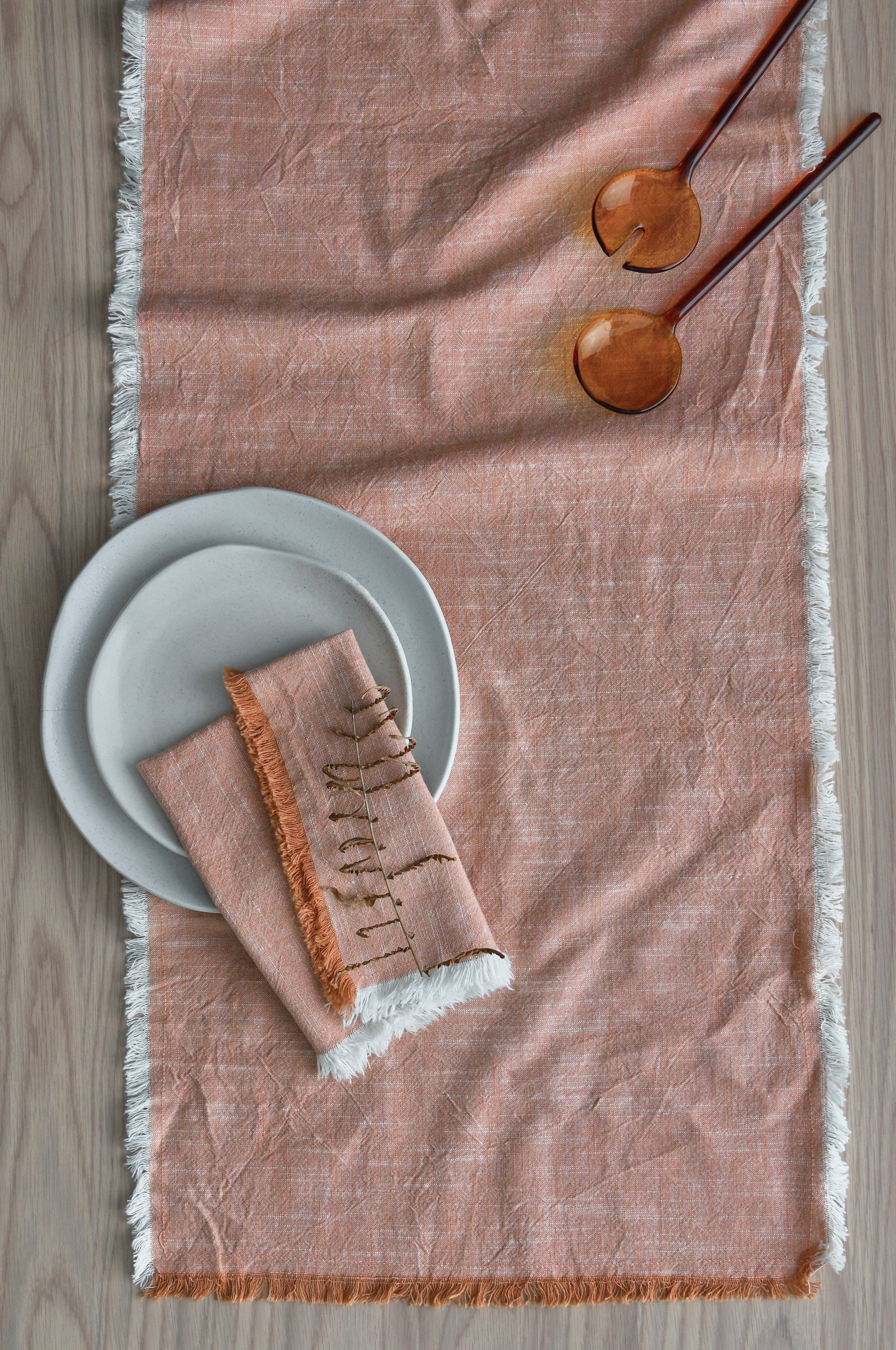 Bordløber i vævet, økologisk bomuld med meleret farve og slubeffekt, hvilket betyder at stoffet har en let struktur. Frynser på 4 sider.