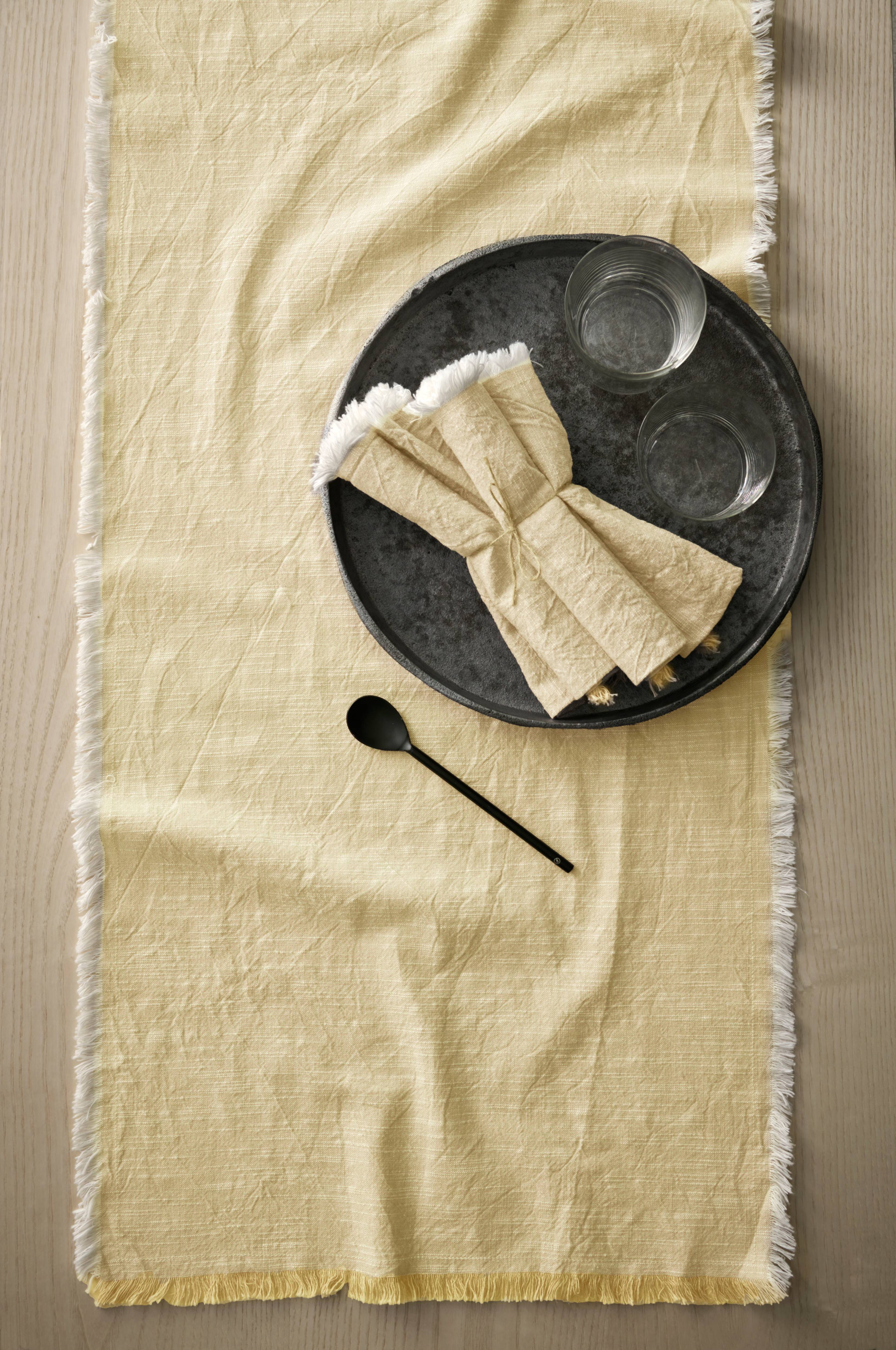 Bordløber i vævet, økologisk bomuld med meleret farve og slubeffekt, hvilket betyder at stoffet har en let struktur. Frynser på 4 sider.