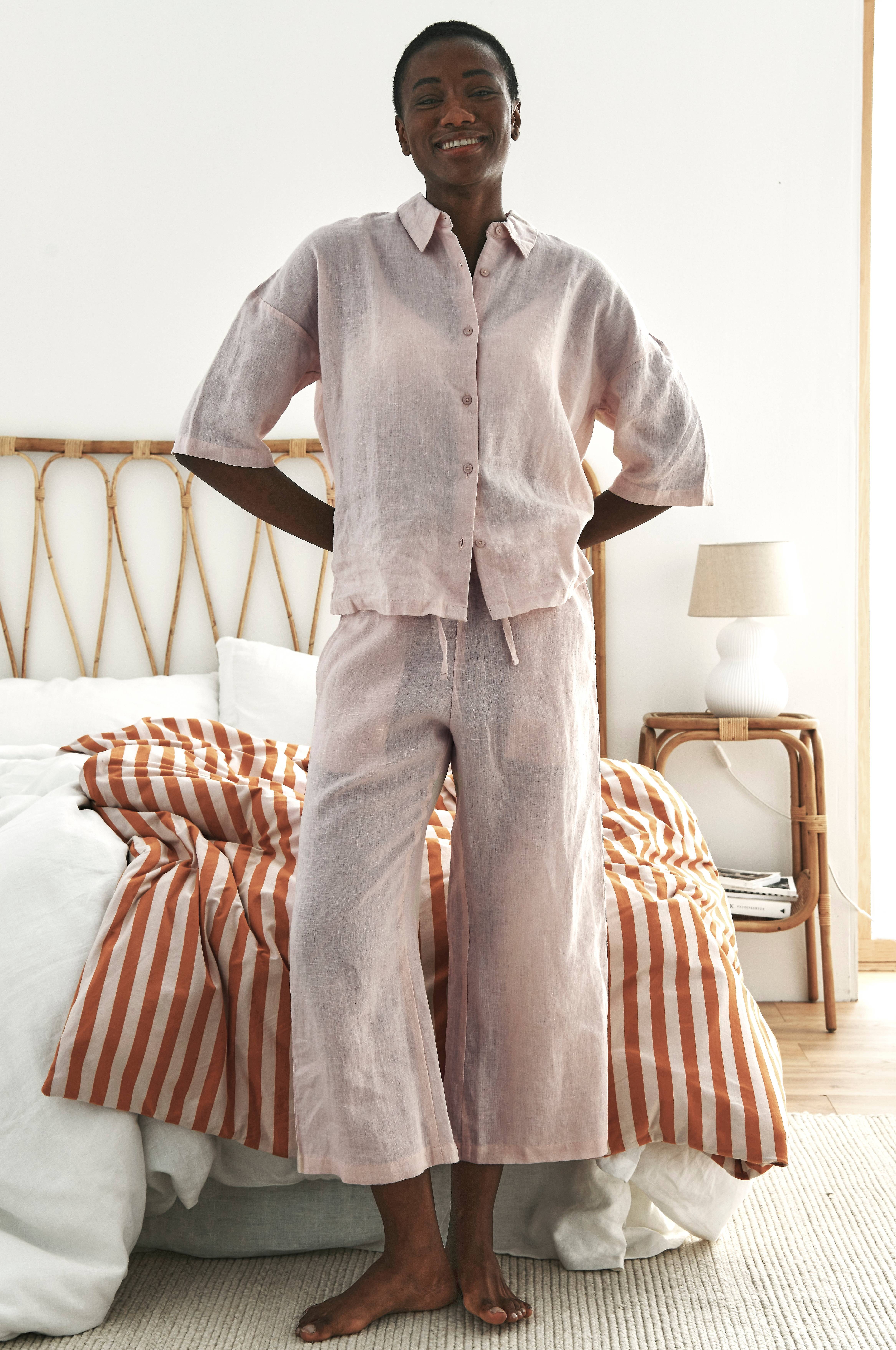Hørbukser i blød, kølig og vasket kvalitet af fransk hør. Vide ben i 3/4-længde. Elastiktalje med løbegang. 2 lommer.