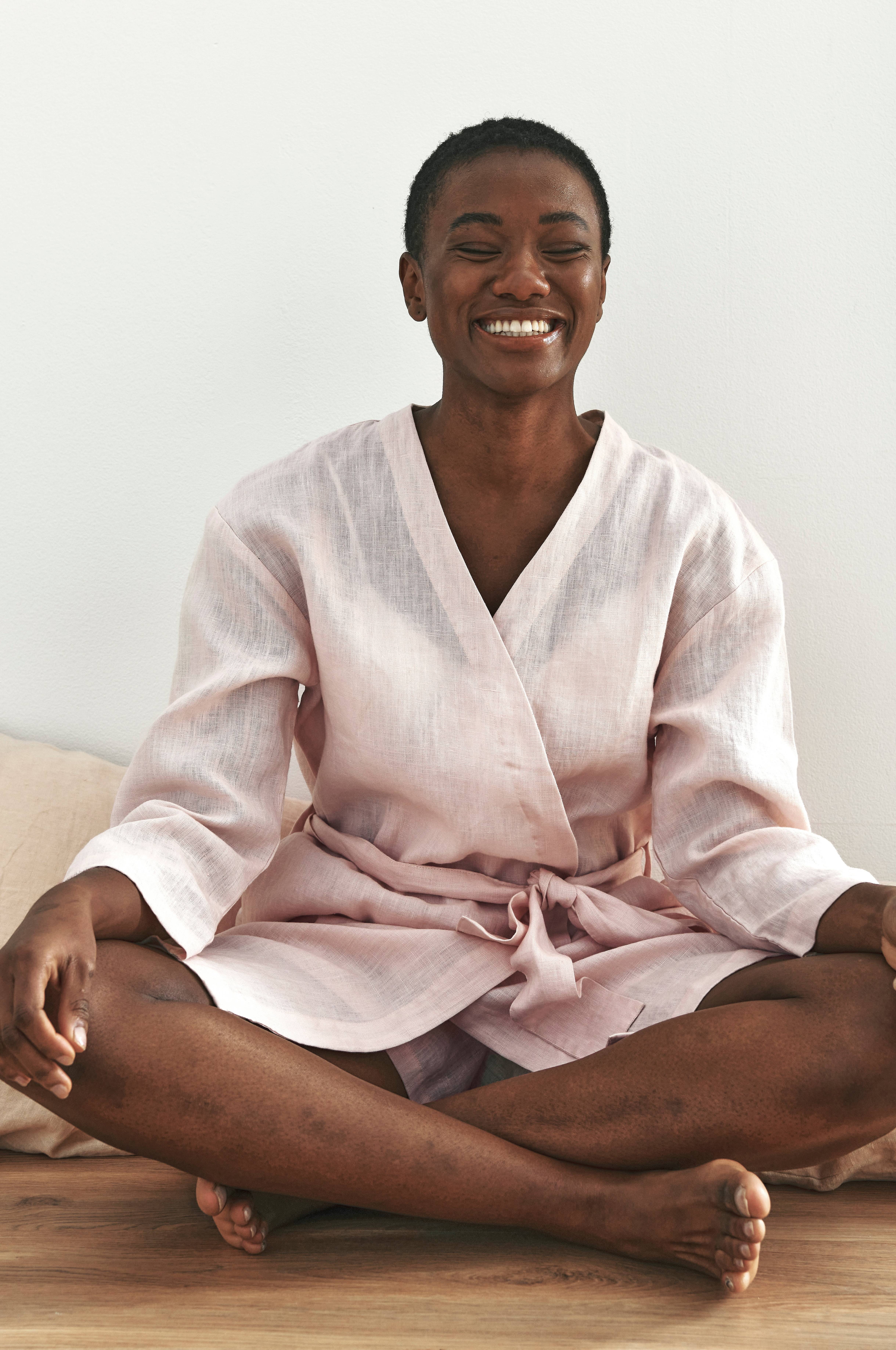 Kimono i blød, kølig og vasket kvalitet af fransk hør. Knælang model med afslappet, løs pasform. Lange ærmer. Aftageligt bindebælte i taljen. To lommer. Længde ca. 97 cm i str. M.