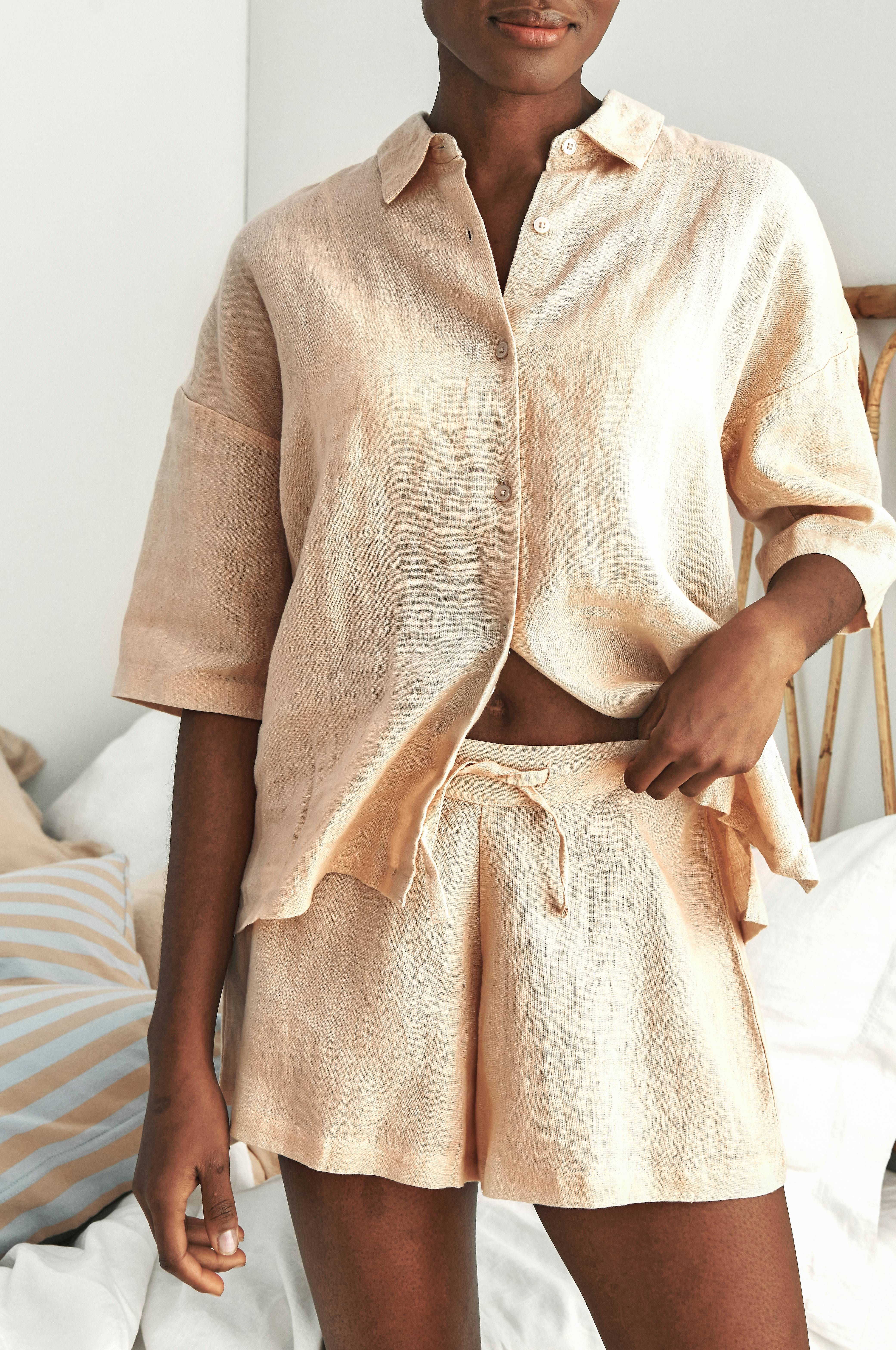 Shorts i blød, kølig og vasket kvalitet af fransk hør. Vide ben. Linning med glat forside og elastik på bagsiden. Løbegang foran. Ingen lommer.