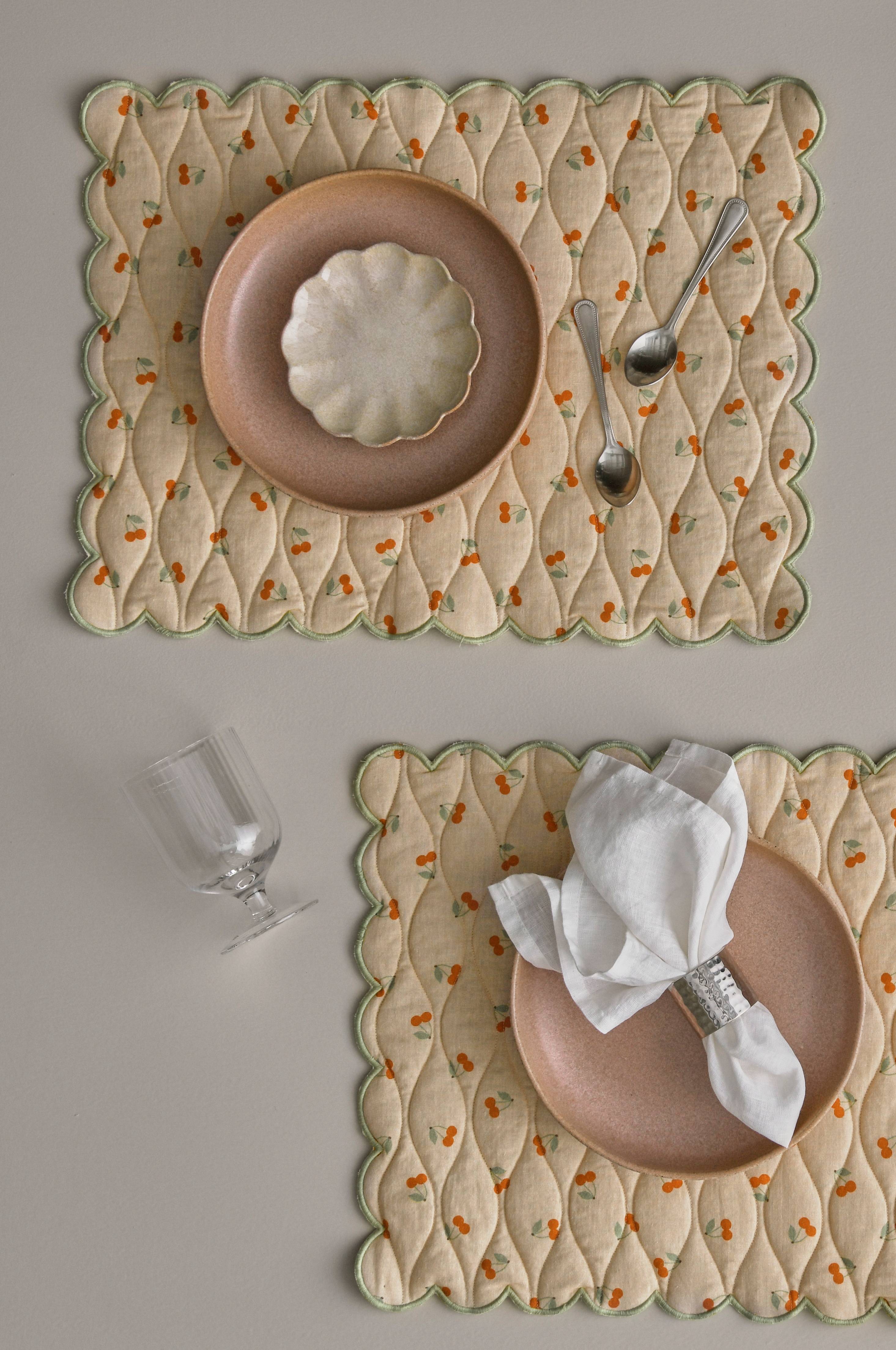 2 stk quiltet og let vatterede dækkeservietter af bomuld med bølgeformede kanter. Printet mønster. Str. 35x48 cm.