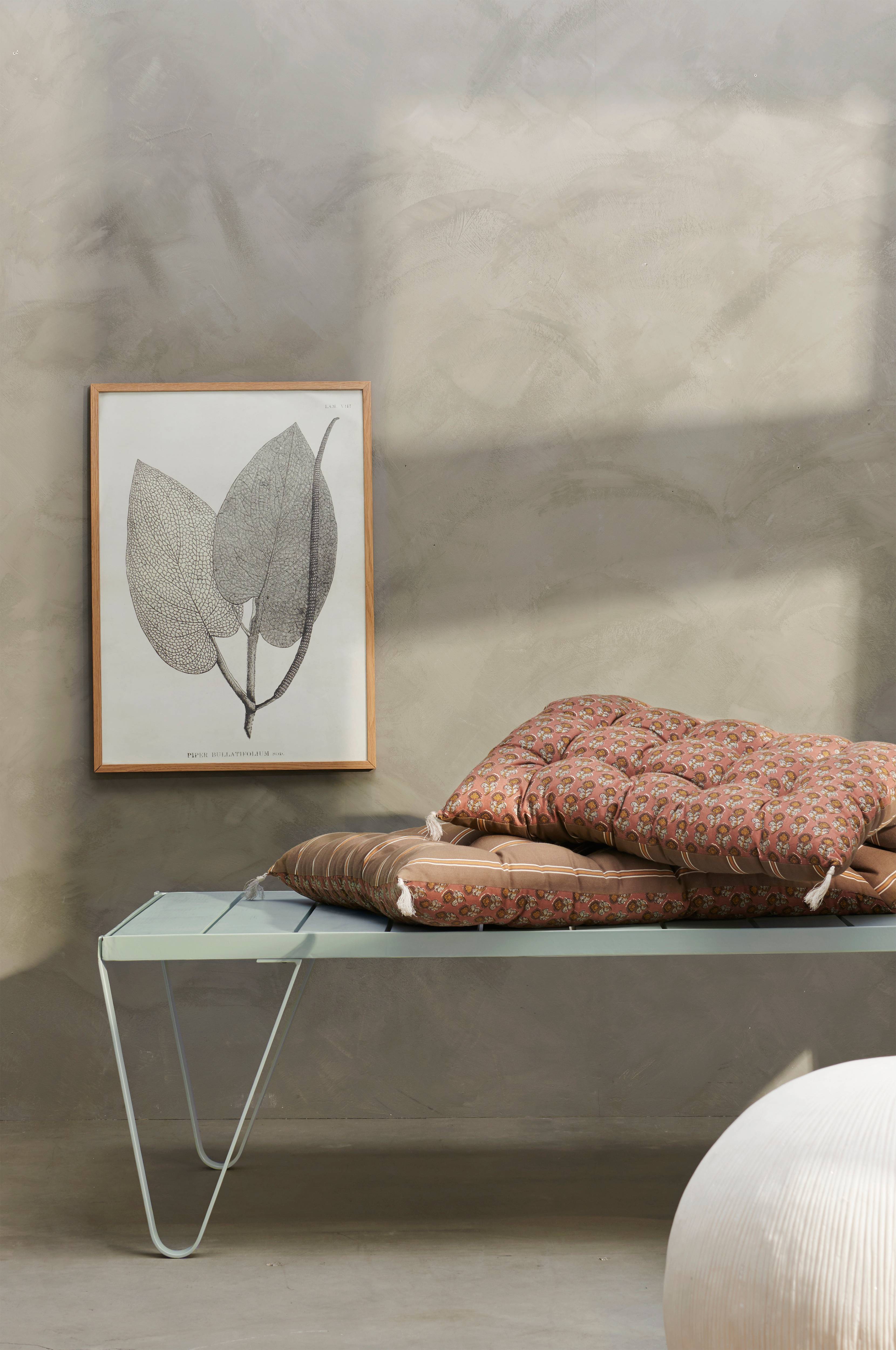 Daybed/bænk i malet mangotræ med ben af metal. Gummihjul på det ene par ben, hvilket gør det nemt at flytte din daybed. Maksimal belastning 100 kg. Mål: Bredde 70 cm, højde 48 cm, længde 153 cm. Maks. vægt 100 kg.Ikke til udendørs brug.