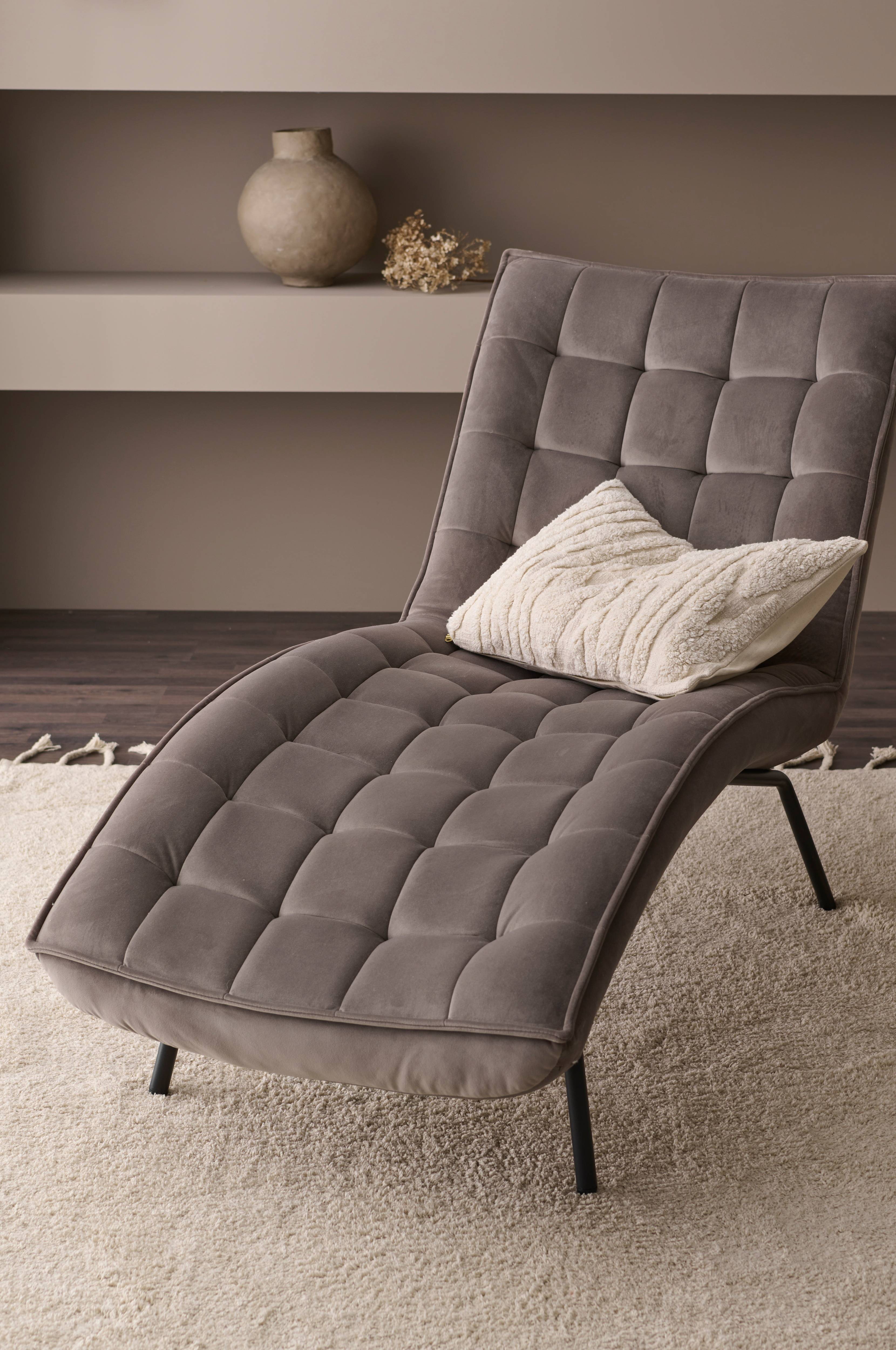 Daybed med paspoleret kant rundt om. Betræk i velour af polyester med indfældninger, der danner et dekorativt ternet mønster. Skumfyld. Ben af metal.