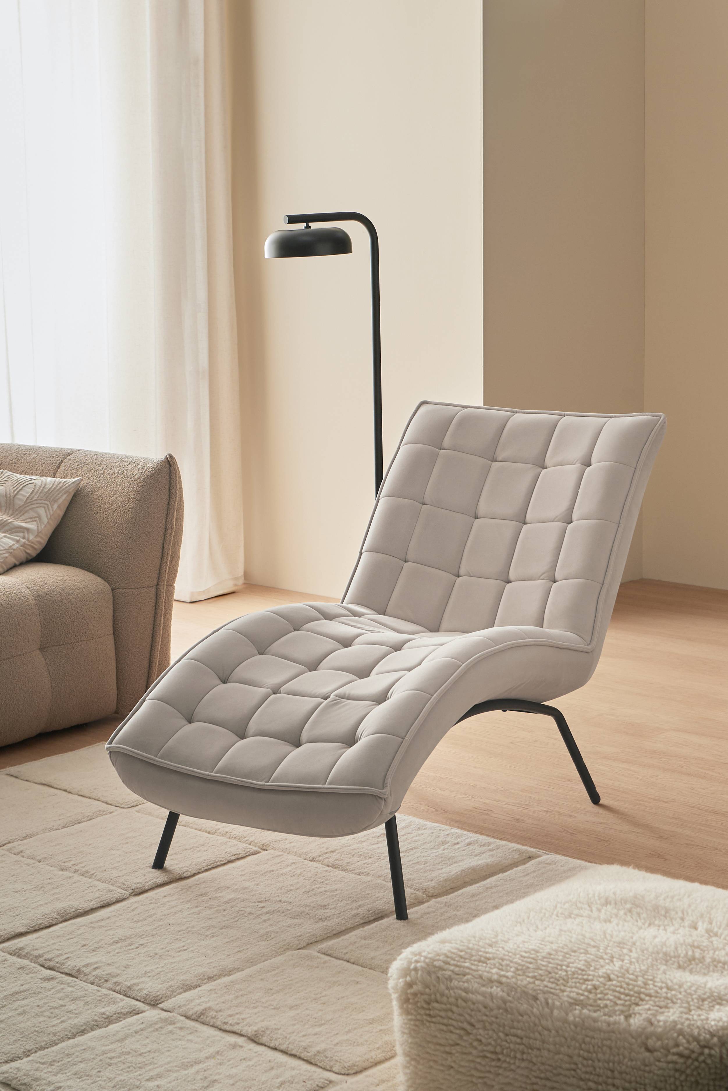 Daybed med paspoleret kant rundt om. Betræk i velour af polyester med indfældninger, der danner et dekorativt ternet mønster. Skumfyld. Ben af metal.