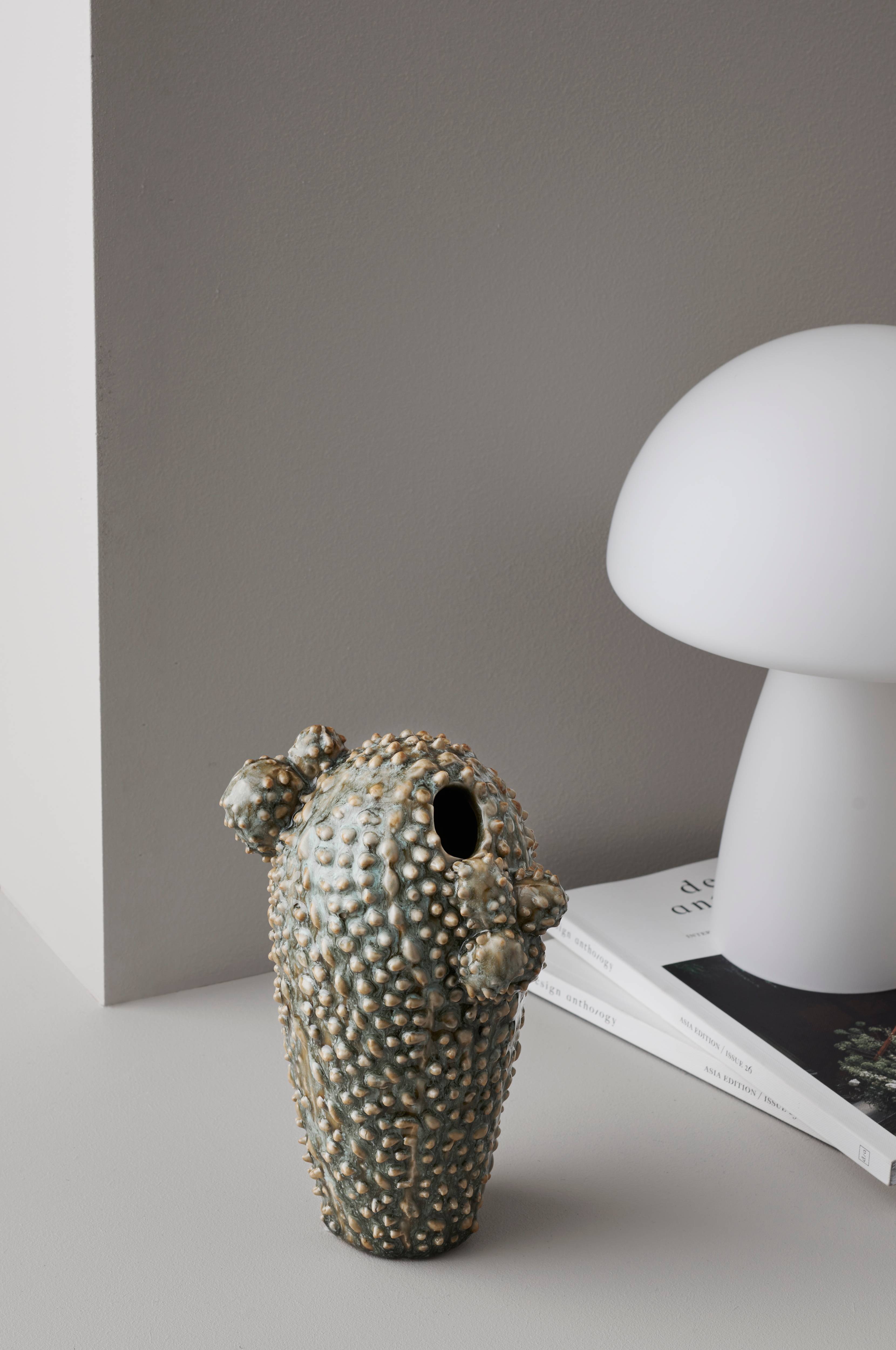 Dekoration af glaseret keramik. Højde 20 cm. Ca. mål foroven: bredde 15 cm, dybde 10,5 cm. Diameter bund 6 cm.