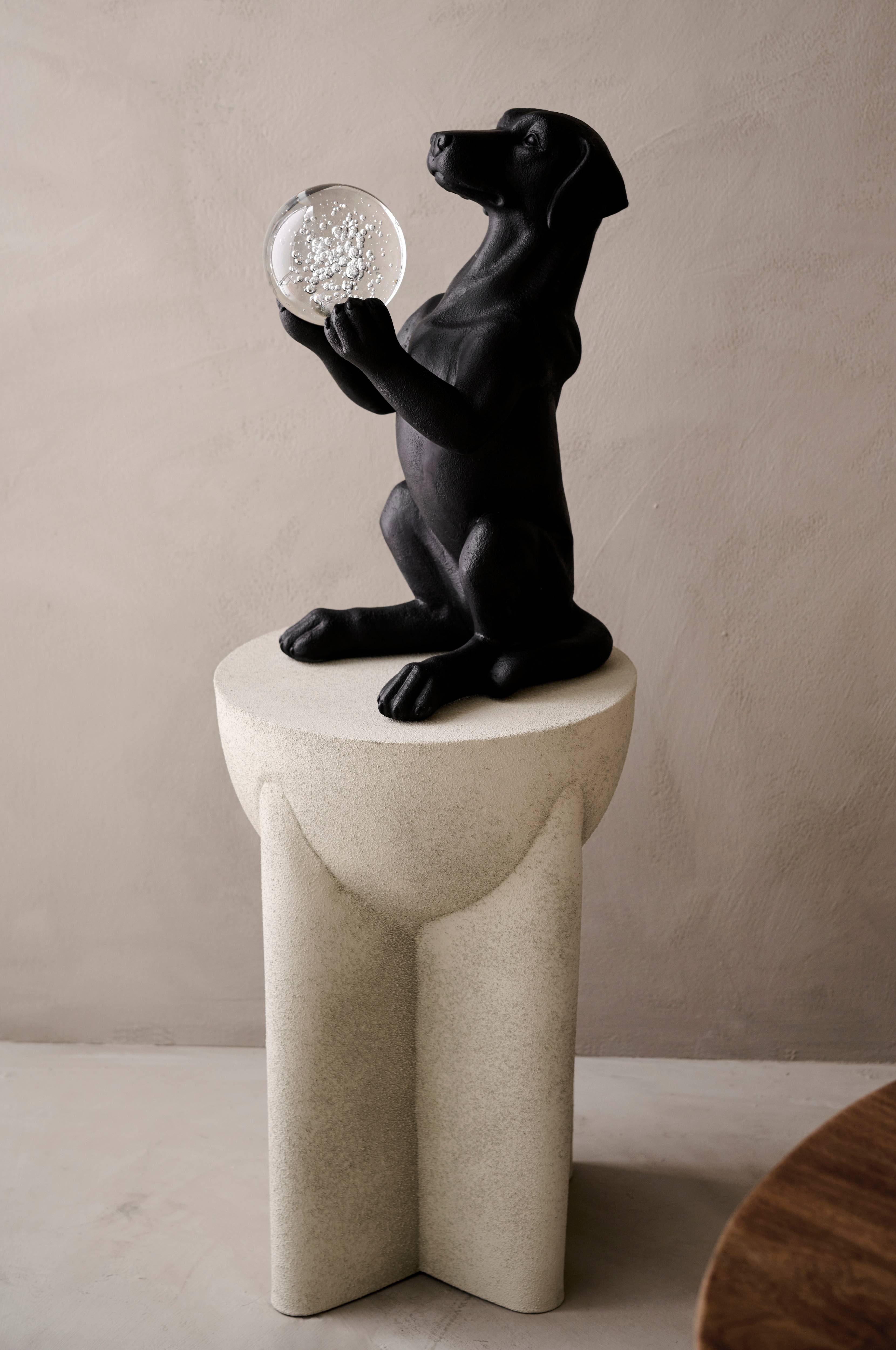 Dekoration i polyresin i form af en hund som holder en glaskugle.