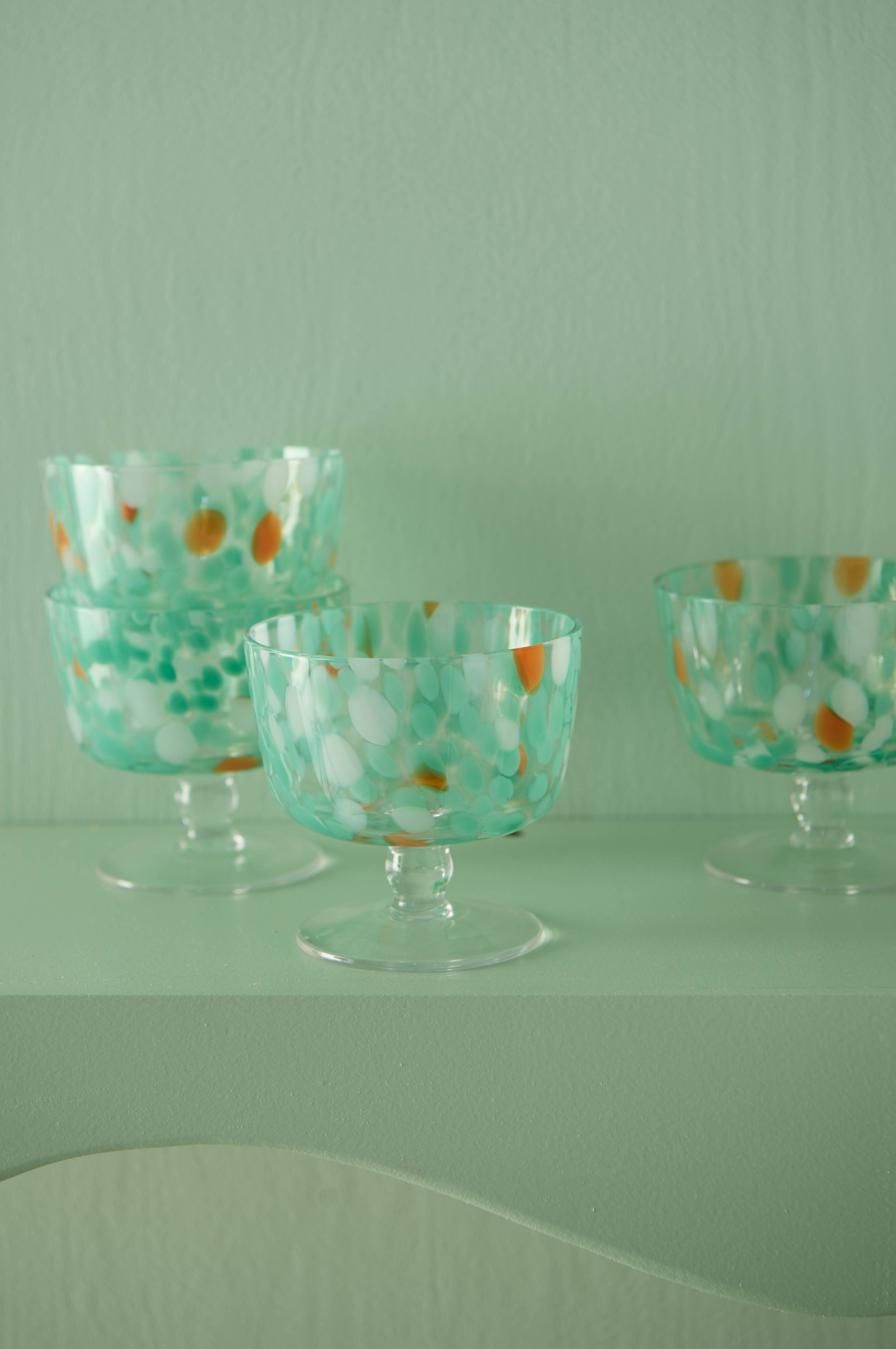 • Fire dessertskåle i glas med et dekorativt mønster• Skålene er håndmalede, og der kan derfor forekomme mindre variationer i farve og mønster i forhold til billedet.