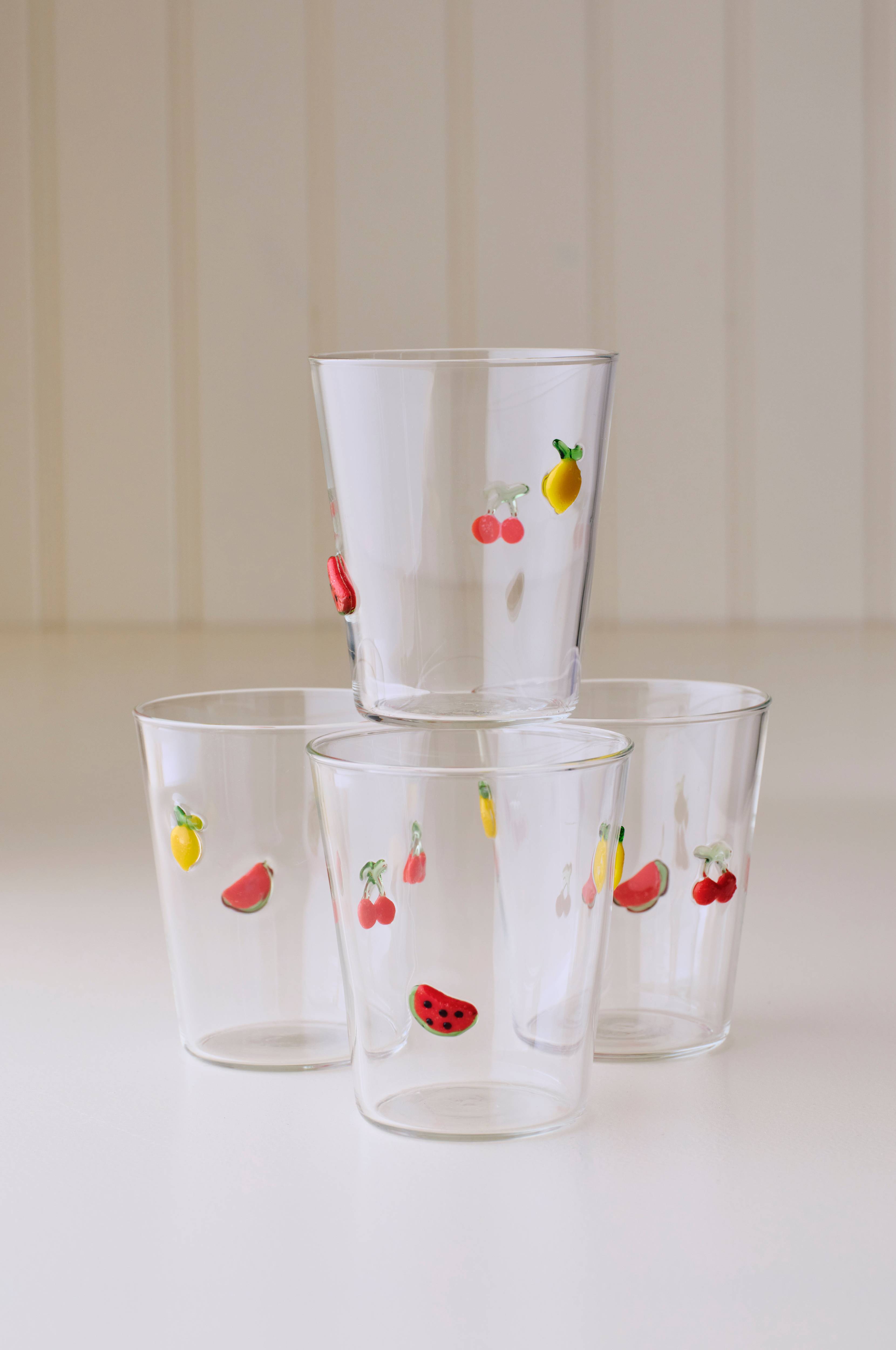 • Drikkeglas med dekorative frugtmotiver hele vejen rundt