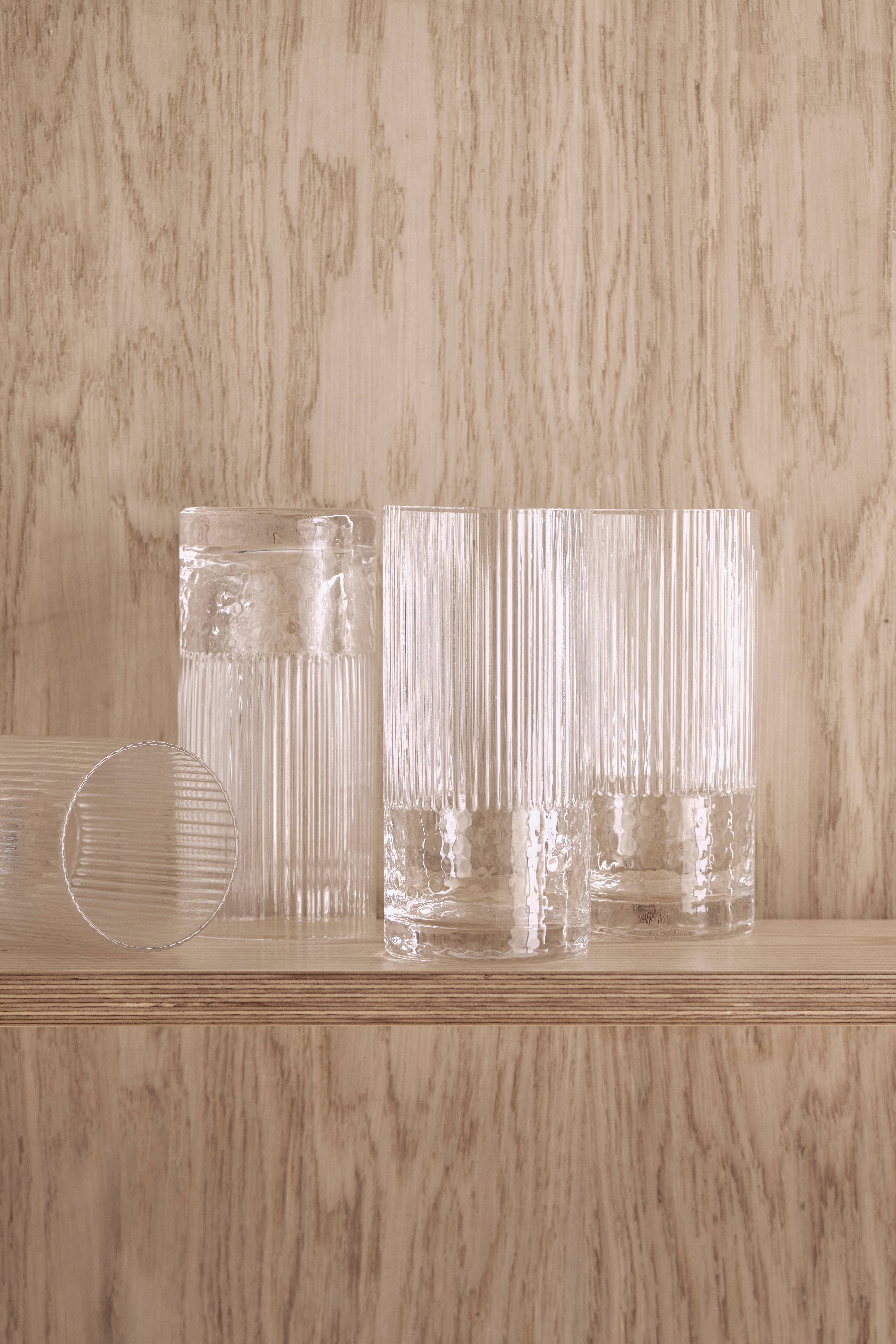 Drikkeglas med rillet overflade i toppen og dekorativ struktur i bunden. Volumen: 460 ml.Tåler opvaskemaskine men ikke mikrobølgeovn.