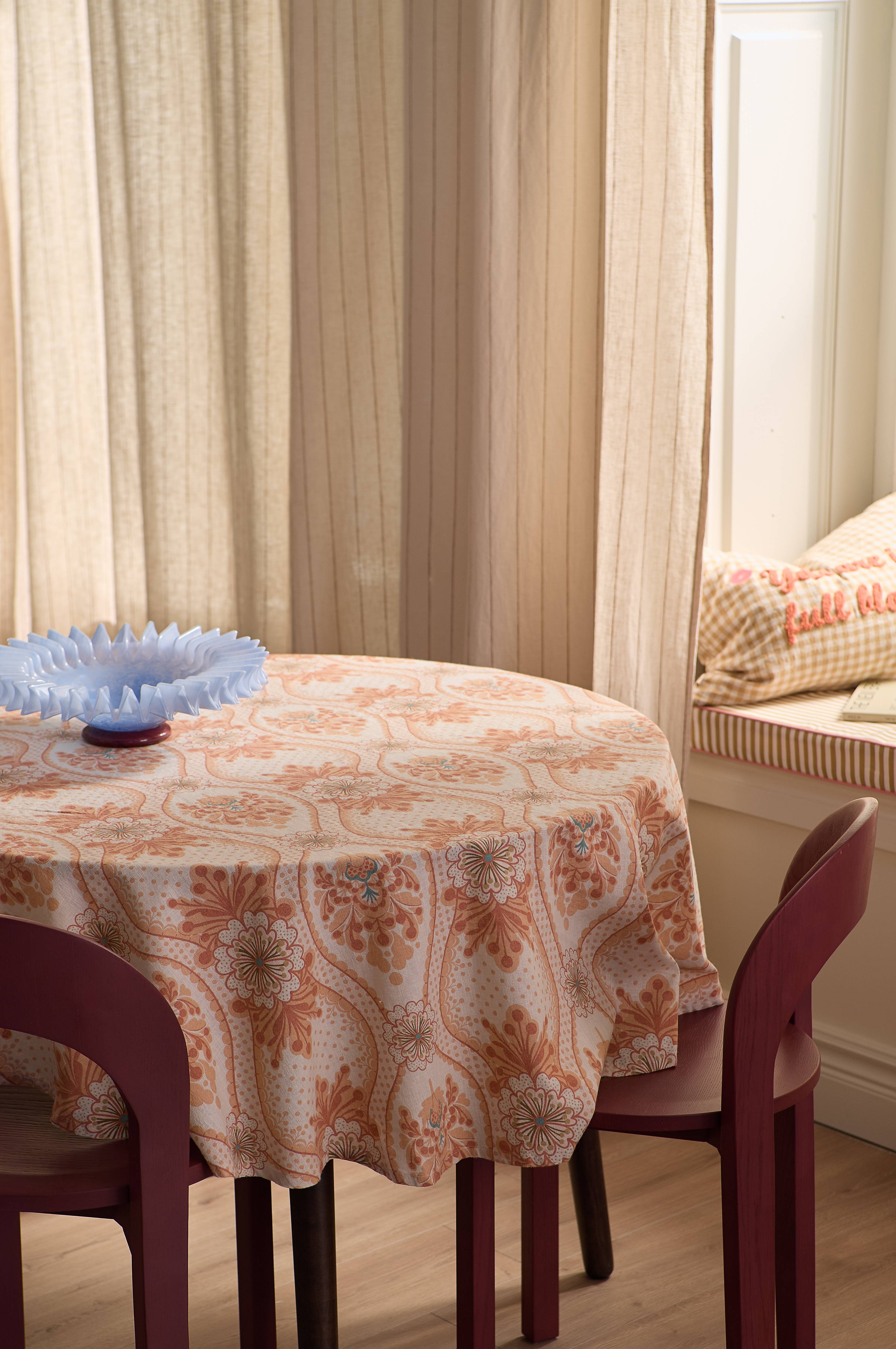 • Rund dug i bomuld og hør med blød, vasket afslutning