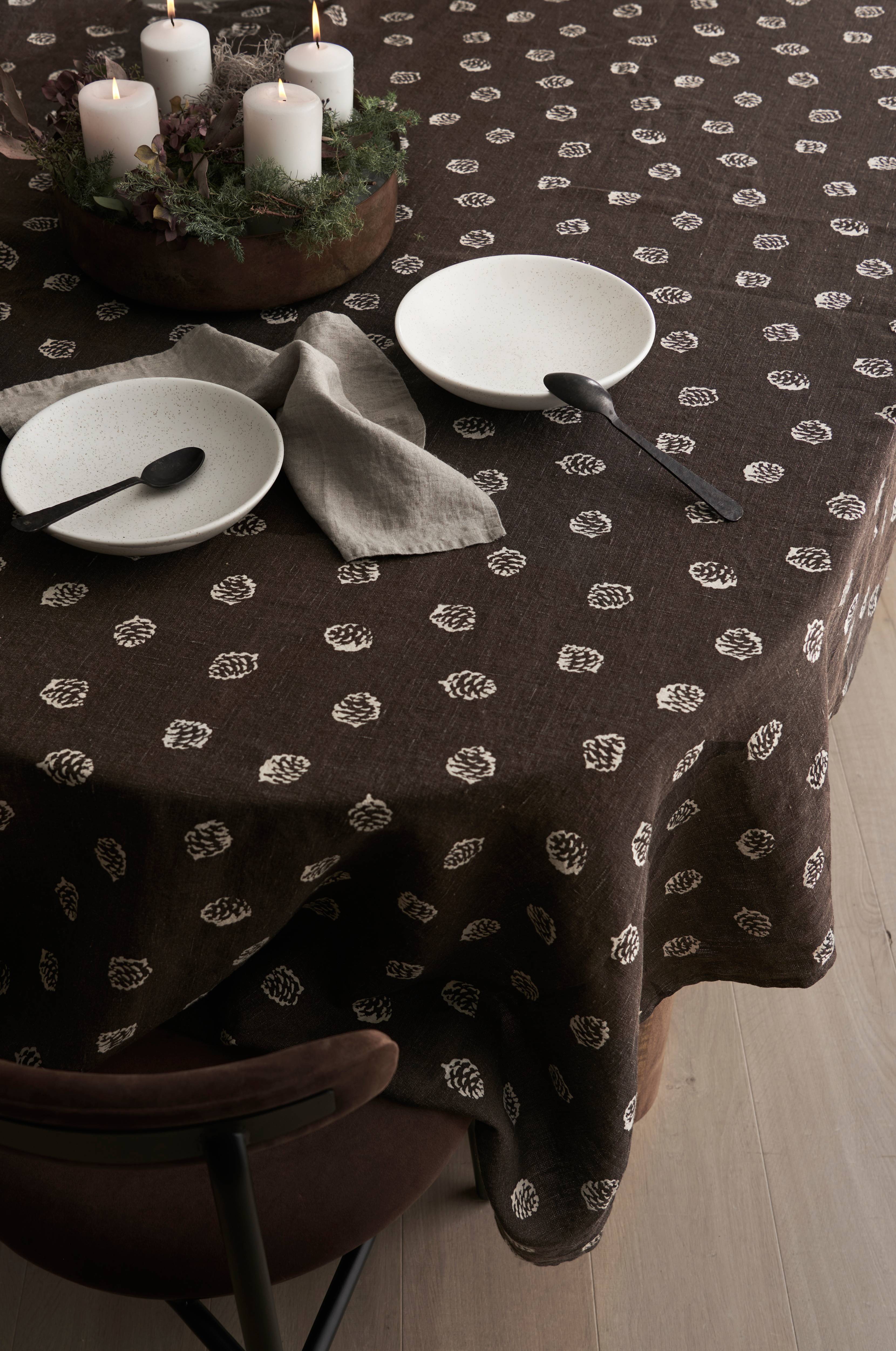 Dug i 100% hør med printet mønster. Vasket kvalitet med lidt grovere struktur.