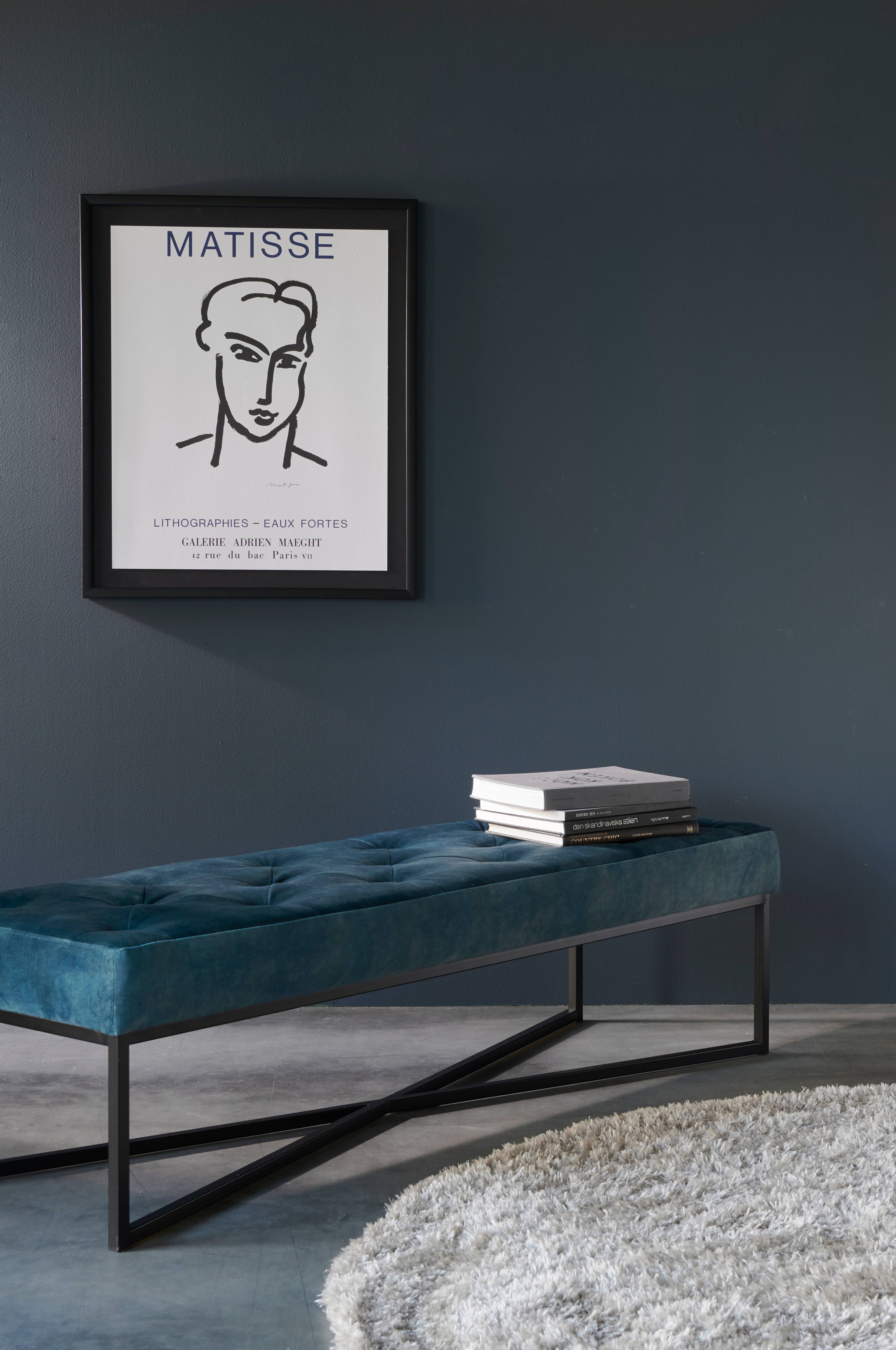 Fodskammel med sorte metalben. Polstring af koldskum. Velourstof, Martindale 88.000, 100% polyester, kemisk rens. Mål 48 x 152, højde 40 cm.