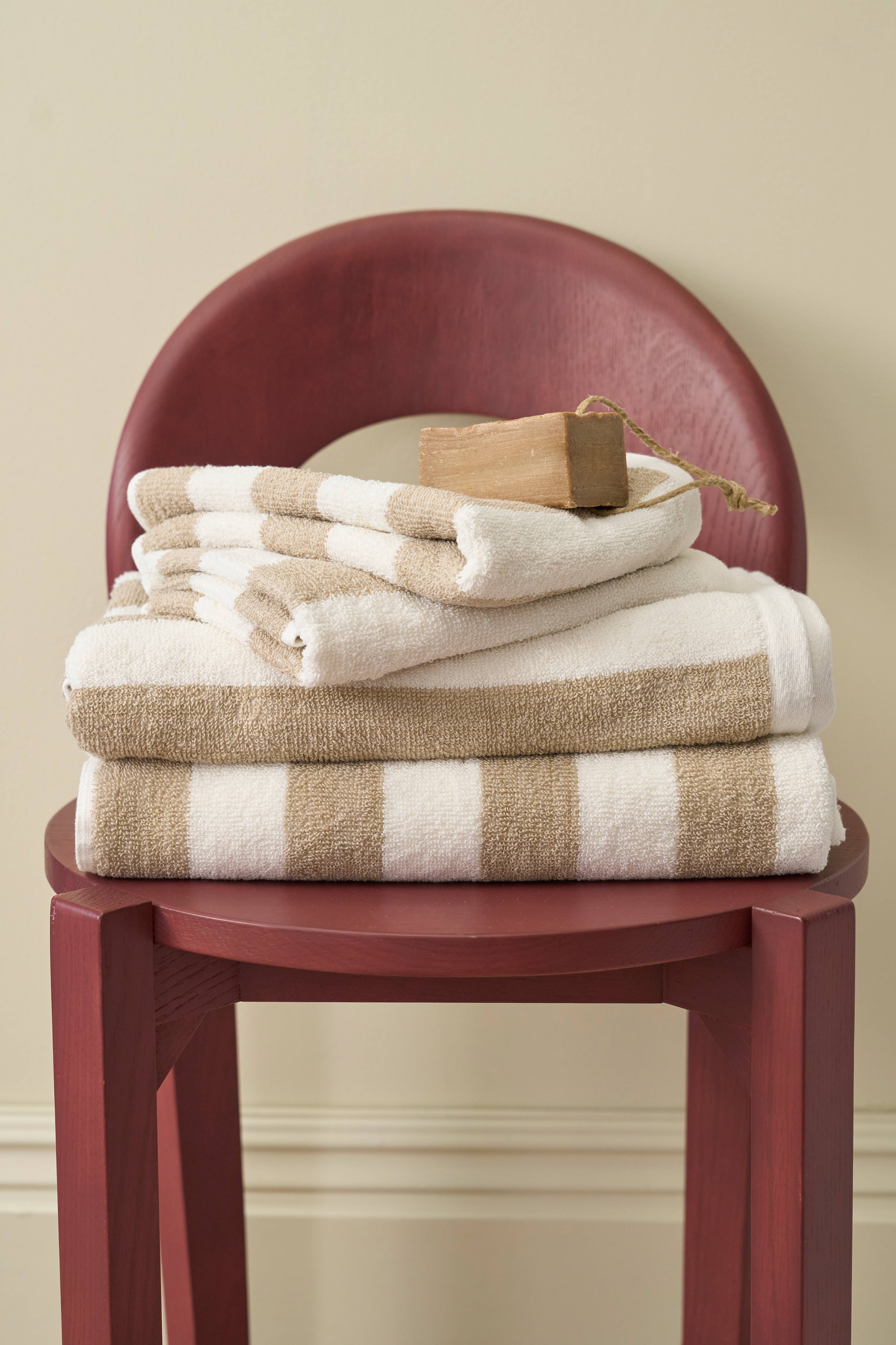 Håndklæder i blød og skøn bomuldsfrotté med garnfarvede striber. Sættet indeholder 2 håndklæder 50x70 cm og 2 badehåndklæder 70x140 cm.