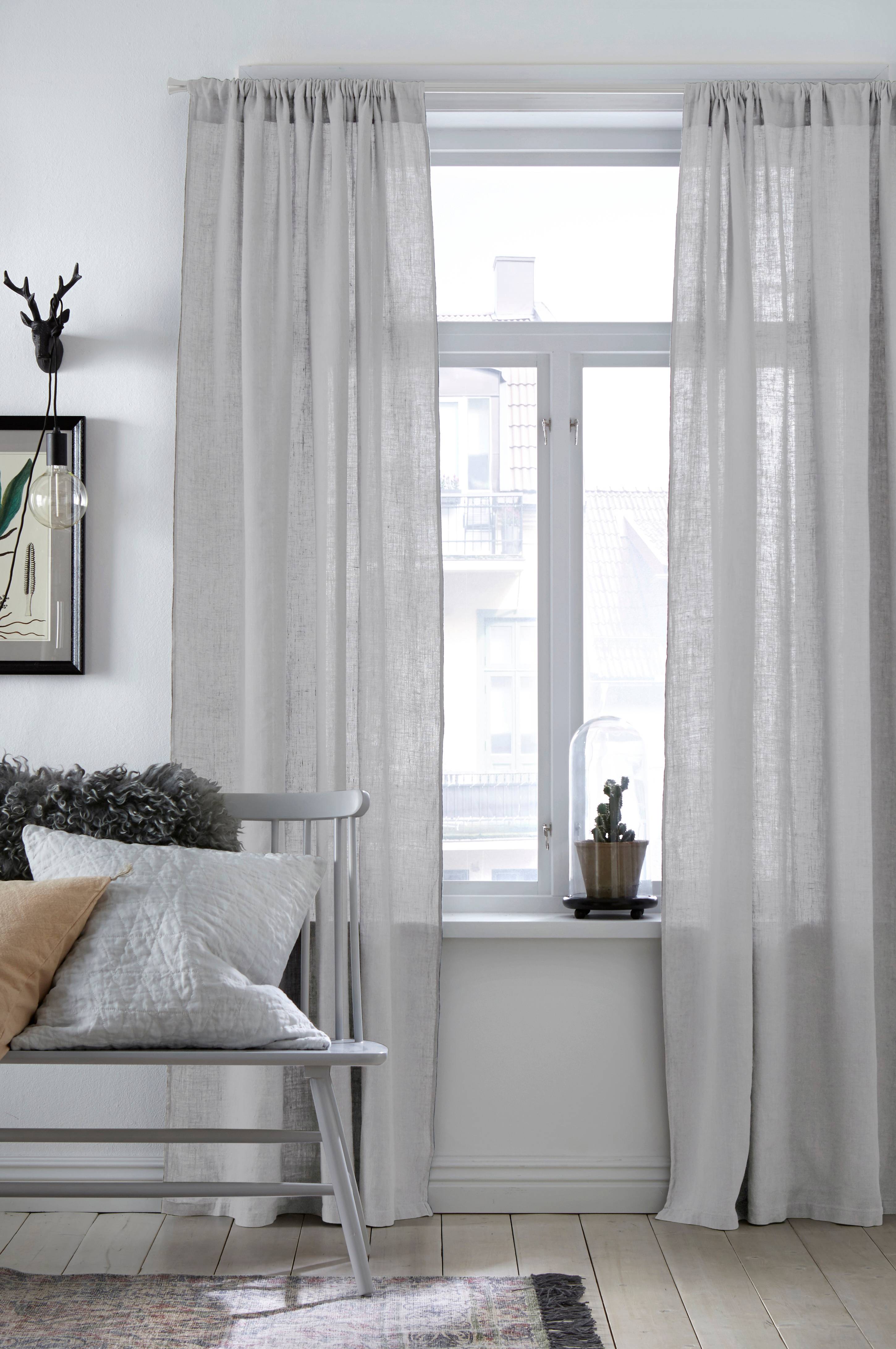 Sømmede sider. Syet løbegang foroven. Bredde 145 cm. Findes i 3 længder: 160 cm, 220 cm & 250 cm. Ægte hør i løstvævet voile med smuk struktur. Kan krybe ca. 7%. Vaskes separat. Vælg mellem at stryge glat eller at tørretumble ved lav temperatur for en blød fornemmelse og et vasket look.