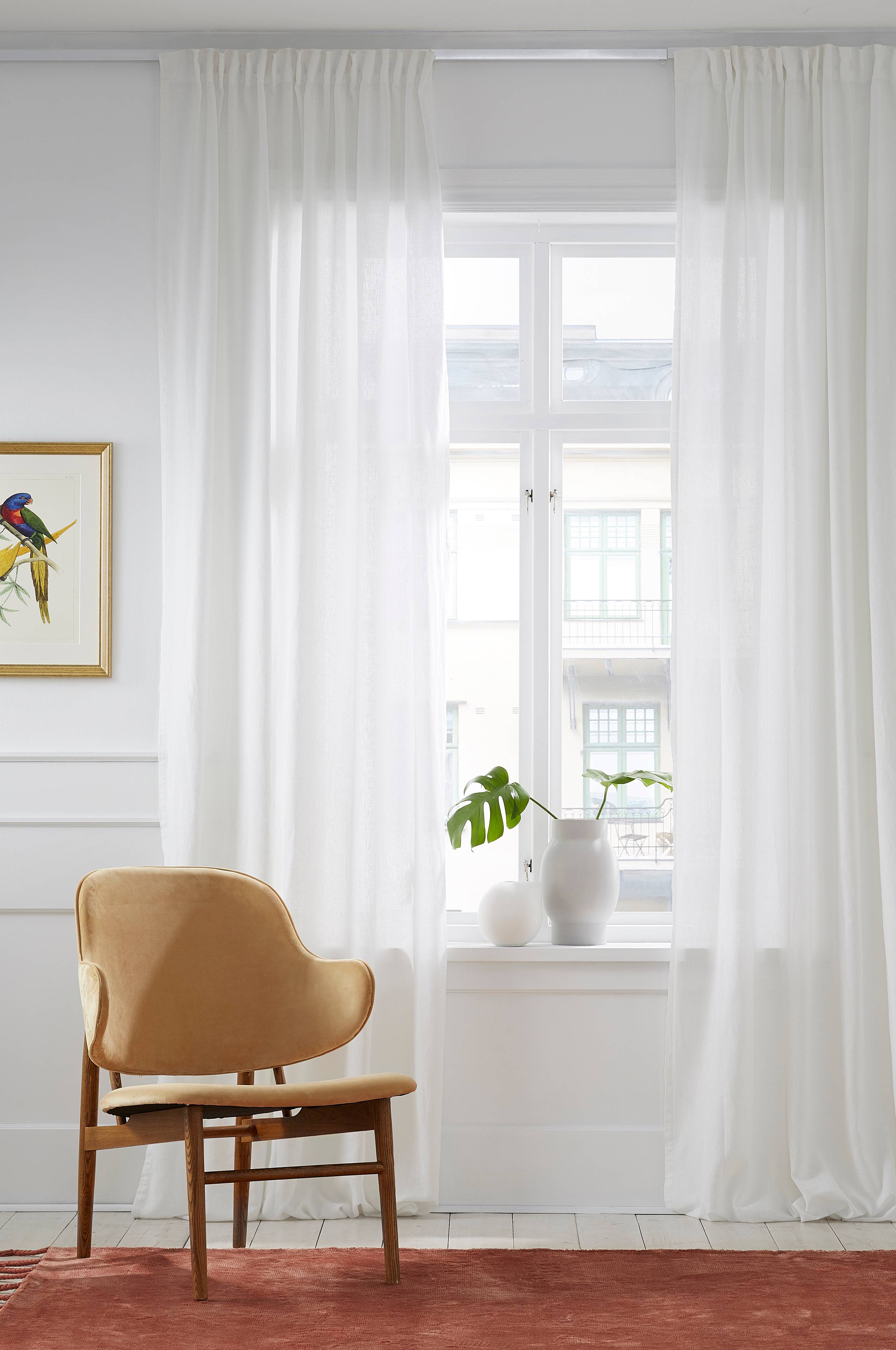 To gardinlængder med rynkebånd i luftig og blød kvalitet af vasket halvlærred. Med kombibånd som gør, at du enten kan hænge gardinerne direkte på en gardinstang eller anvende rynkebåndskroge eller nålekroge (ikke fingerkroge). Snoren i rynkebåndet gør, at du let kan skabe ensartede, flotte læg. Bredde 145 cm. Tre længder: 220, 250 og 300 cm.