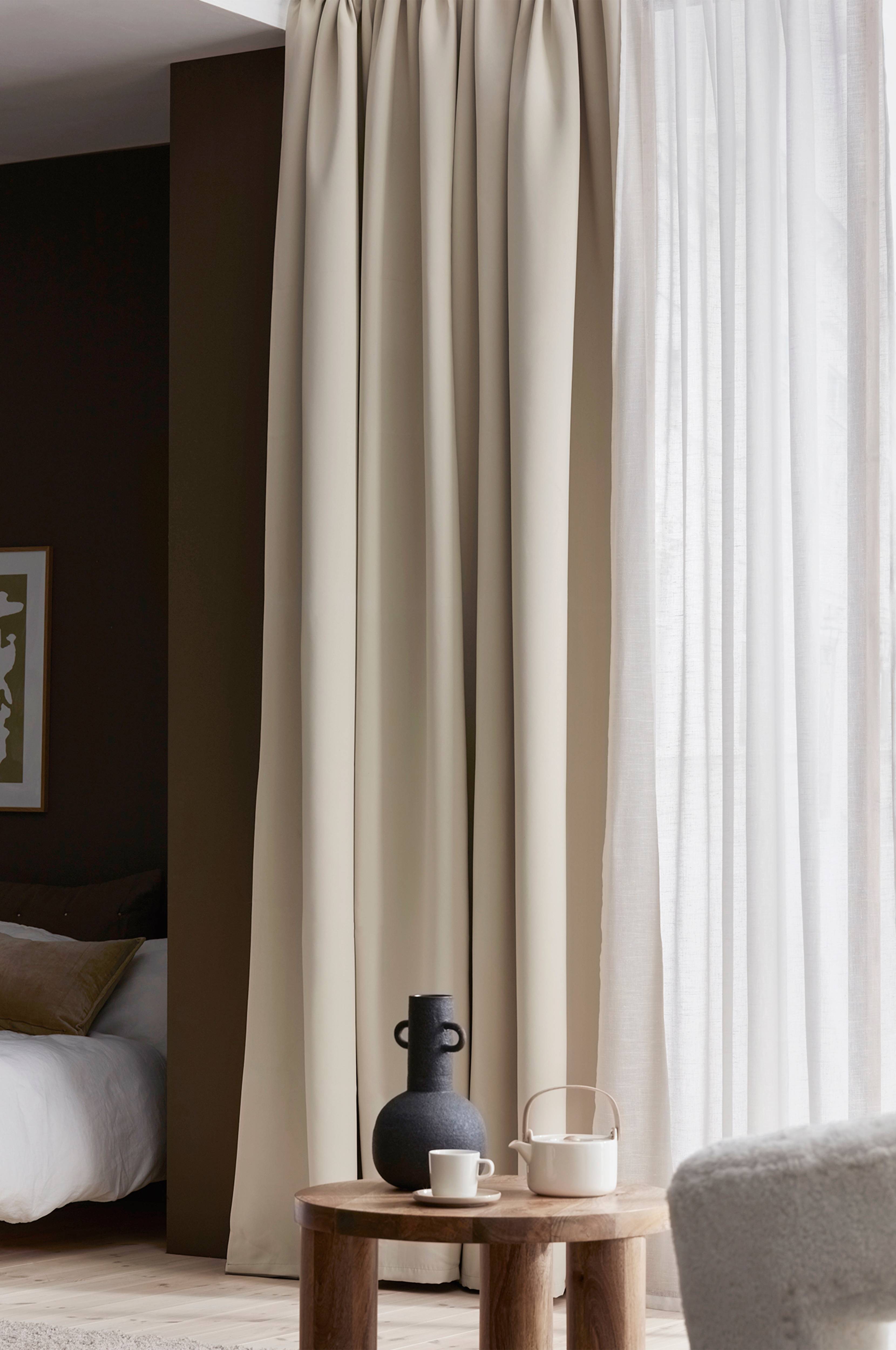 Mørklæggende gardinlængde med rynkebånd med indvævede sorte tråde som gør at gardinet holder 95% af lyset ude. Med kombibånd som giver dig flere løsninger og muligheder, så du kan hænge gardinet på forskellige måder. Du kan enten hænge gardinlængden direkte på en gardinstang gennem de skjulte stropper på bagsiden, eller bruge ringe og rynkebåndskroge, nålekroge eller fingerkroge. Gardinlængde med rynkebånd passer også godt til brug på gardinskinne. Snore i rynkebåndet gør at du let kan skabe ensartede, flotte læg. Matchende farve tone-i-tone på bagsiden. Bredde 280 cm, længde 300 cm. Sælges i 1-pak.