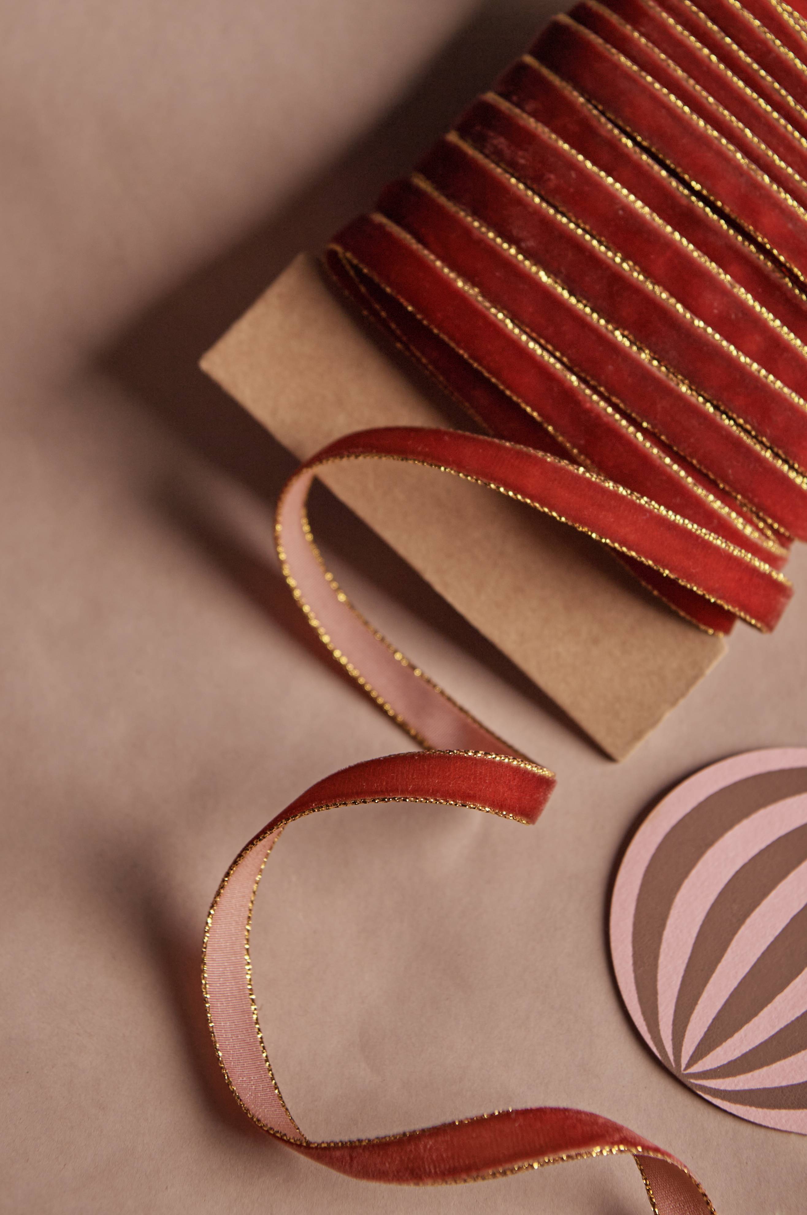Bånd i velour af 100% nylon med guldglitrende kanter. Bredde 9 mm, længde 20 m.