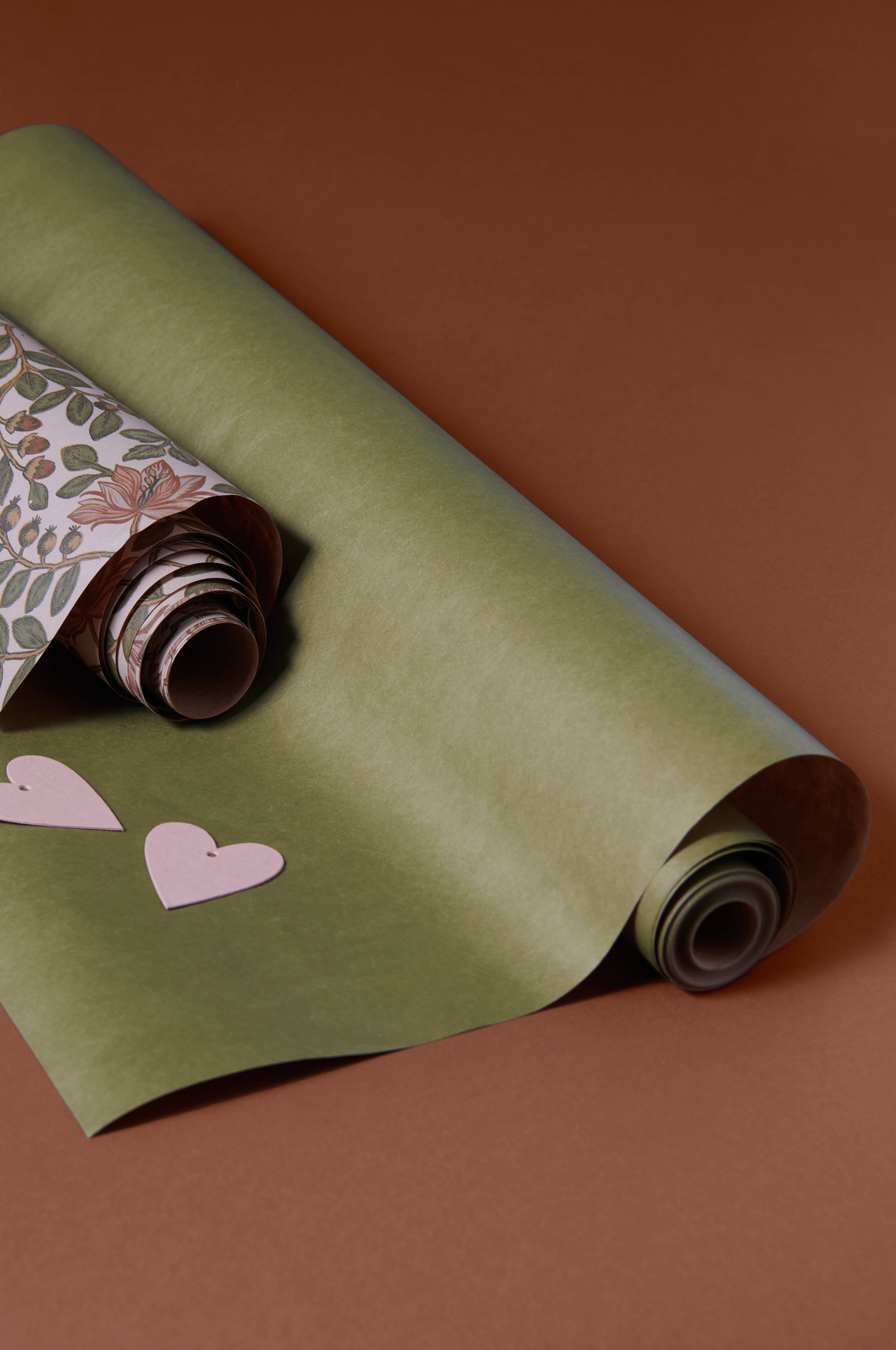 Printet, ensfarvet brunt papir i kraftig kvalitet. 80 g. Bredde 57 cm. Længde pr. rulle 10 meter.
