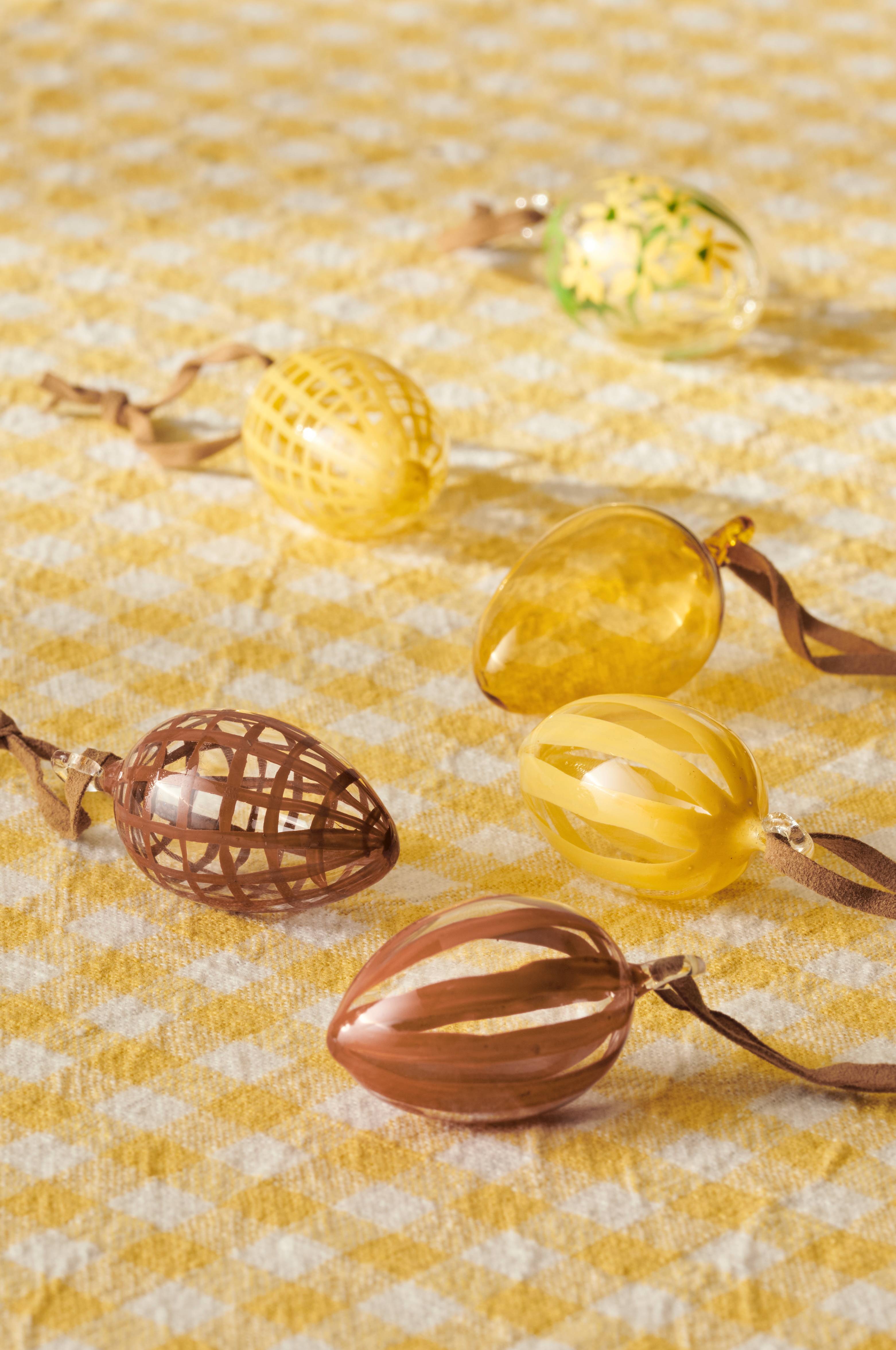 Håndmalede påskeæg af glas i 6-pak med forskellige mønstre og farver. Da produkterne er håndmalede kan mindre variationer i mønstrene forekomme.