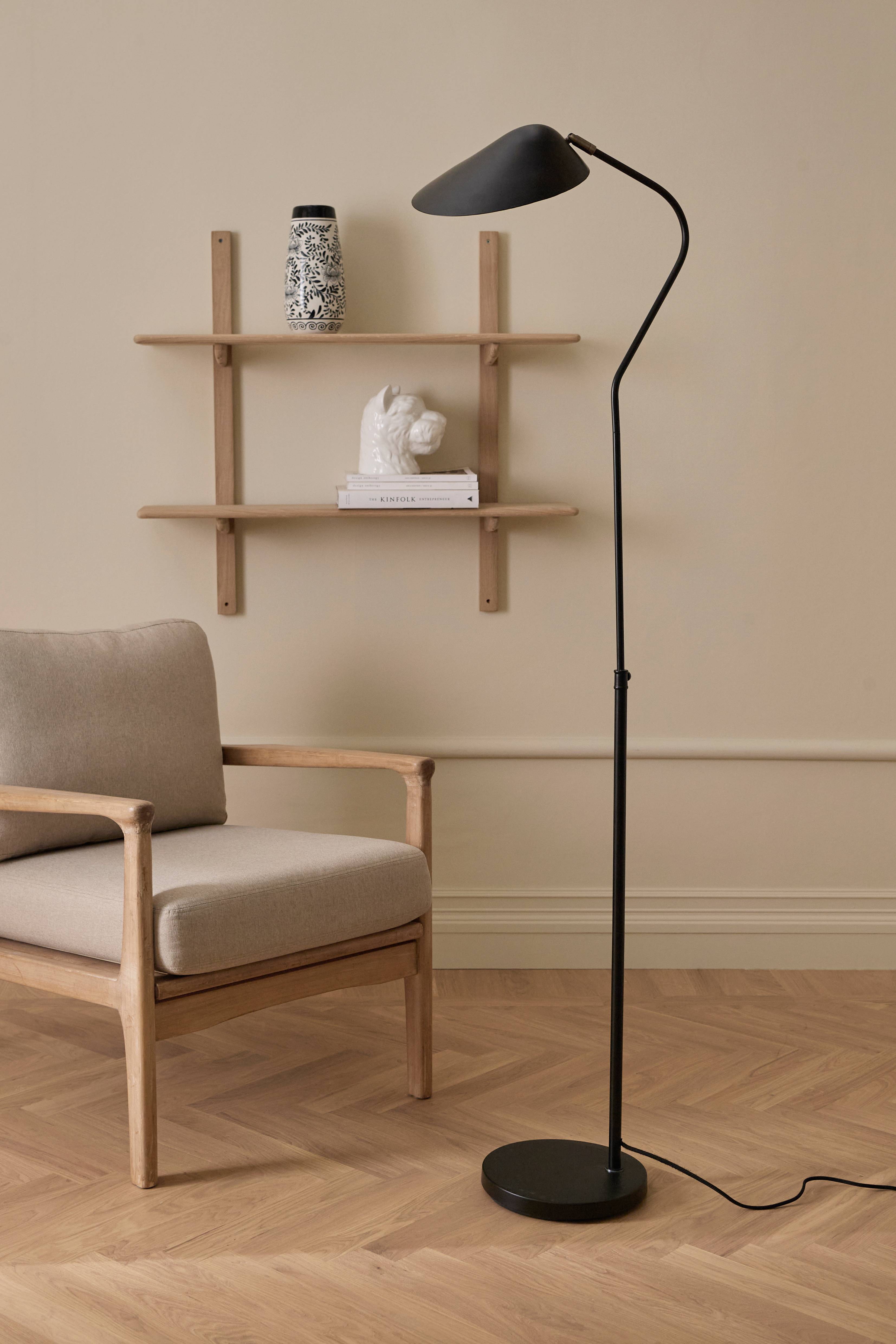 • Gulvlampe i pulverlakeret metal med asymmetrisk skærm• Detalje i messingfarvet metal• Tekstilsnor med Fodkontakt• Justerbar højde 150-177 cm• Lampeskærmen kan frit justeres i højden og til siderne• Lampefod: ø 26 cm.• Pære medfølger ikke