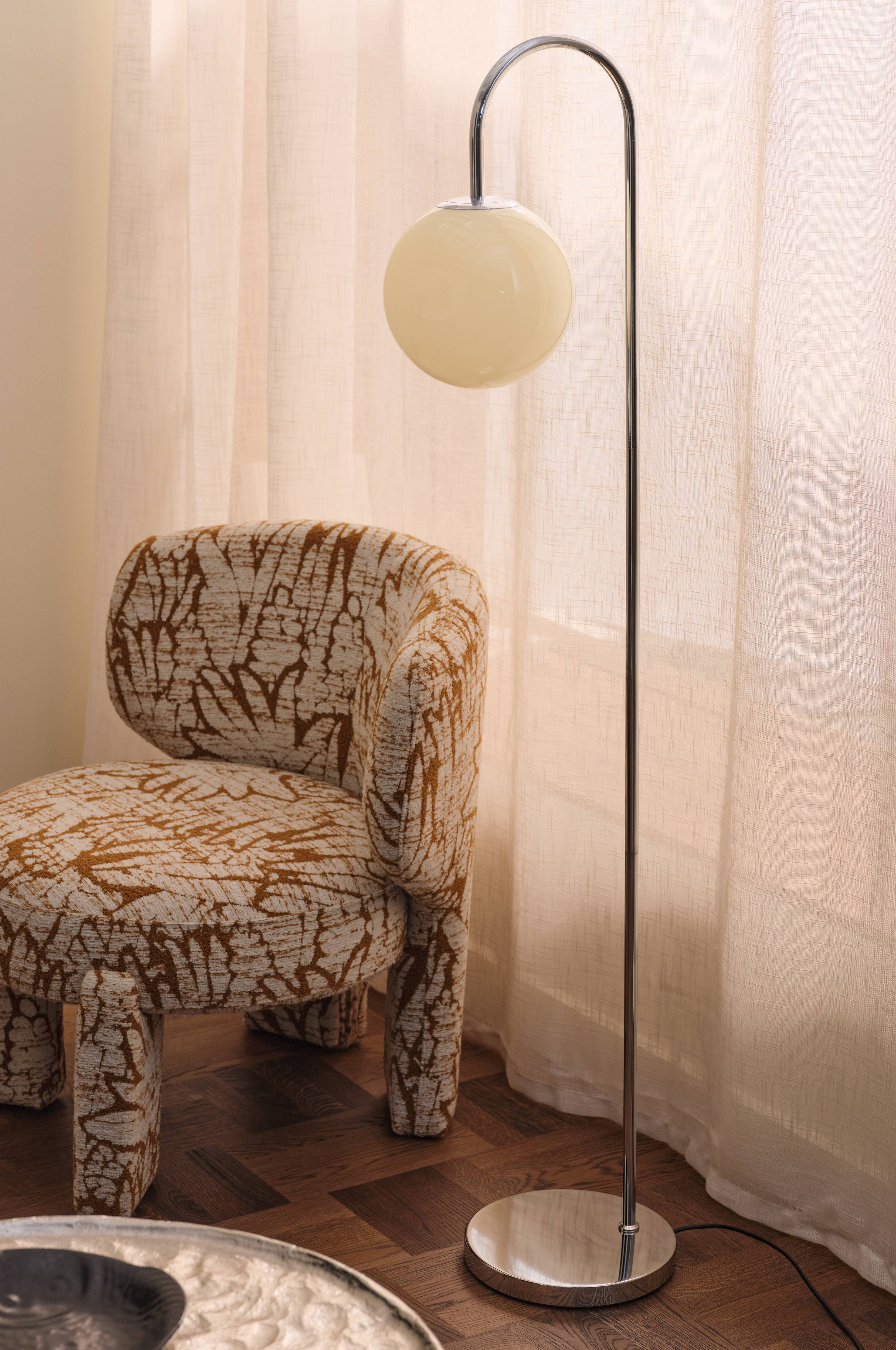 • Gulvlampe i forkromet metal• Rund hatteskygge i glas• Plastledning med Fodkontakt• Pære medfølger ikke