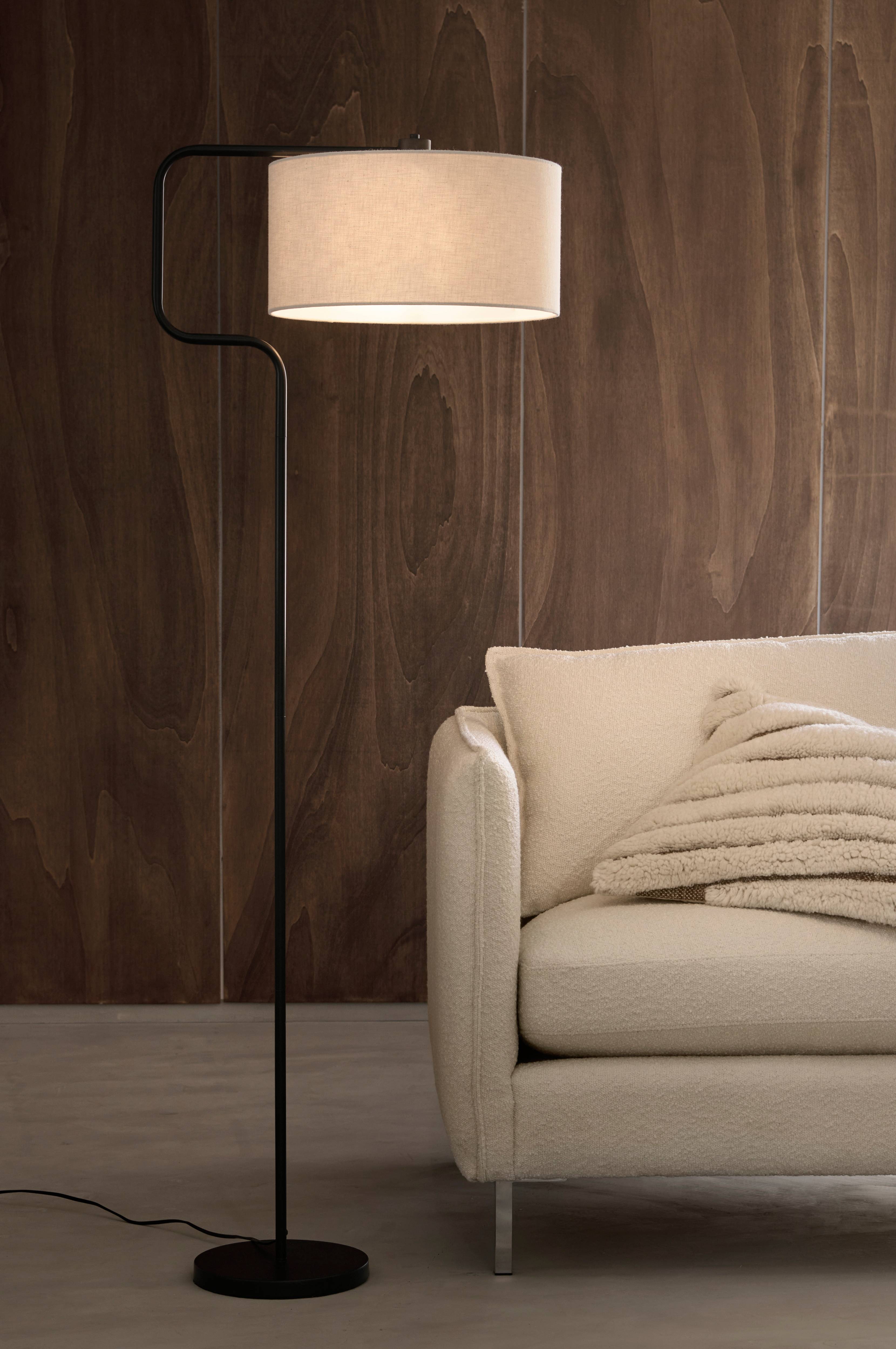 Gulvlampe med fod i metal. Skærm i hørstof med let struktur.Mål på skærmen: Diameter 40 cm, højde 20 cm.Mål på foden: Diameter 25 cm, højde 3 cm.Sort ledning med strømafbryder ved gulvet. Pære medfølger ikke.