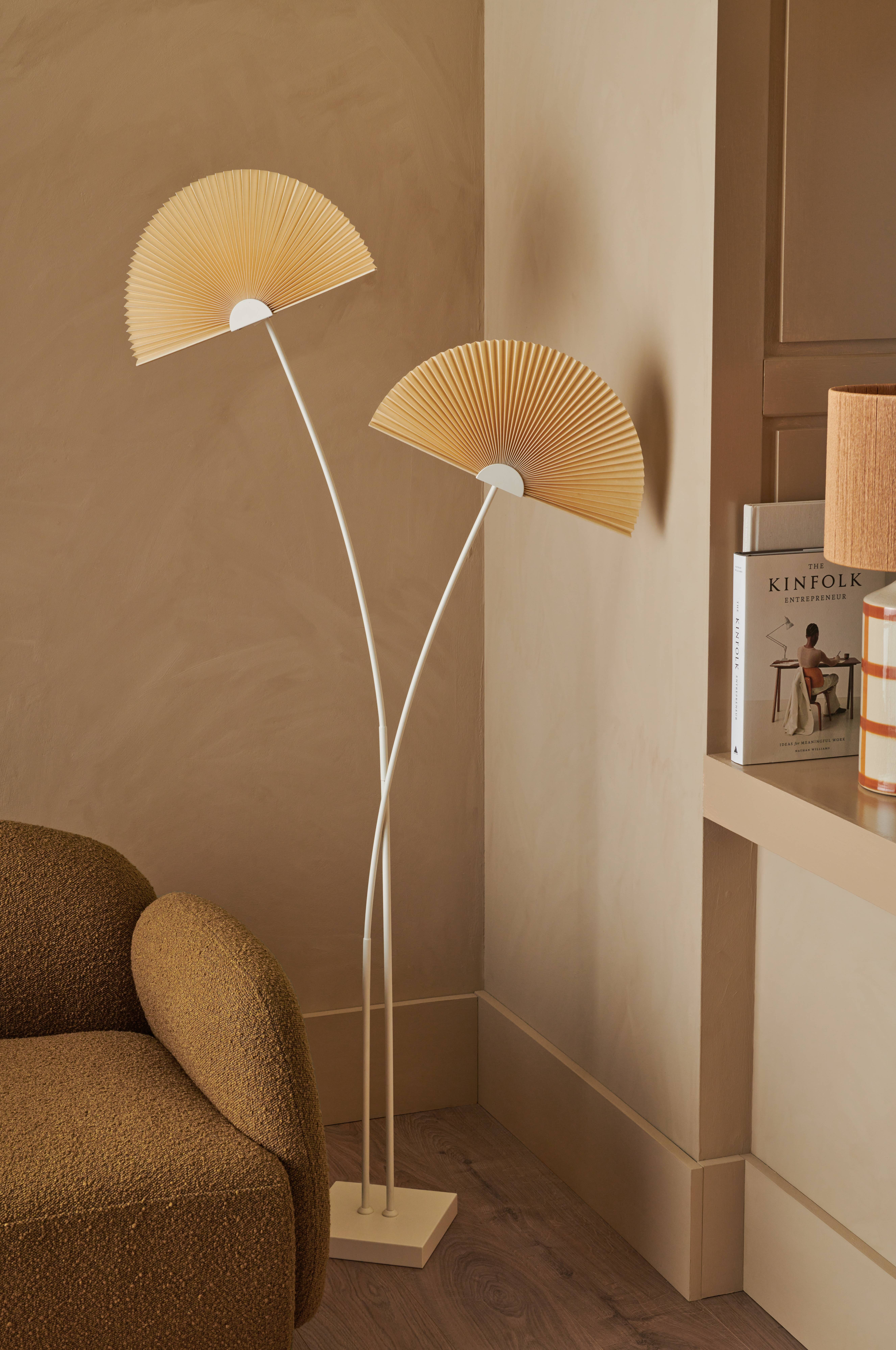Gulvlampe af metal i mat finish med to plisserede skærme af papir. Skærmens mål: Diameter 40 cm, højde 20 cm. Fodplade mål: 20x20 cm. Ledning med fodafbryder. Pære medfølger ikke.