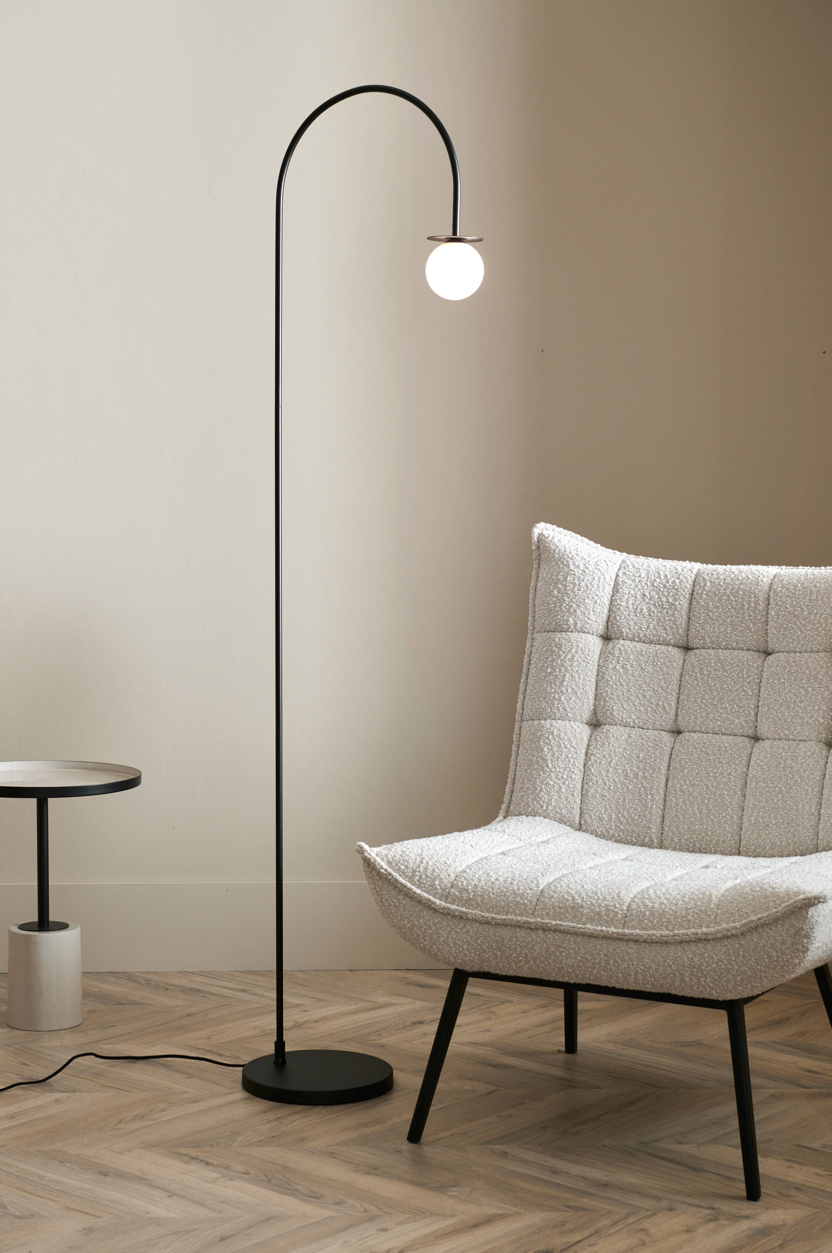 Gulvlampe i messingfarvet metal eller pulverlakeret sort metal med kuppel i opalhvidt glas. Kuplen fastgøres og løsnes med skruefunktion. Glaskuplens diameter 10 cm. Fodplade mål: diameter 28 cm, højde 3 cm. Sort stofledning med gulvafbryder. Pære medfølger ikke.