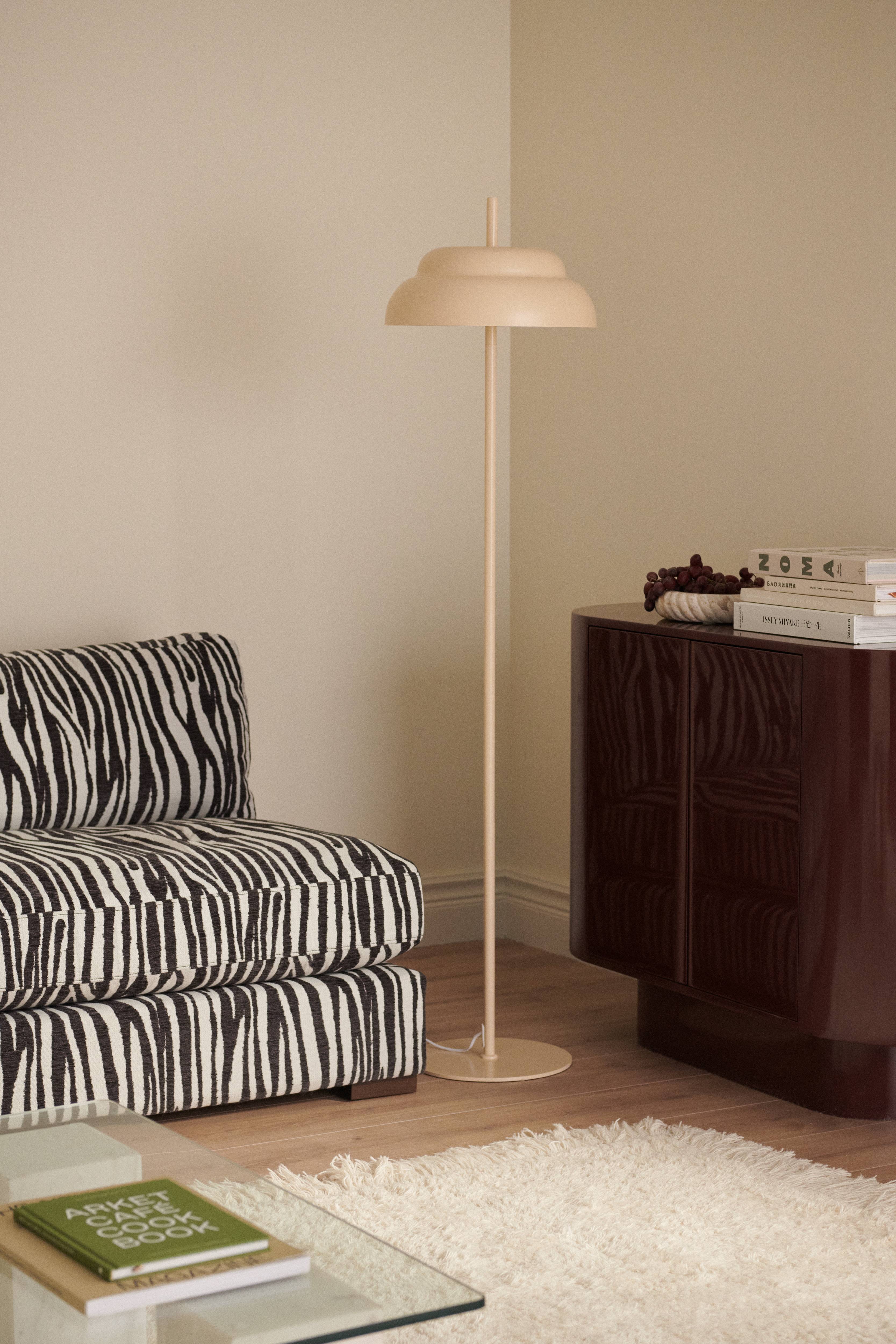 • Gulvlampe i lakeret metal med diffusor på undersiden af skærmen, der giver et blødt, blændfrit lys• To lyskilder• Tekstilsnor med Fodkontakt• Pære medfølger ikke