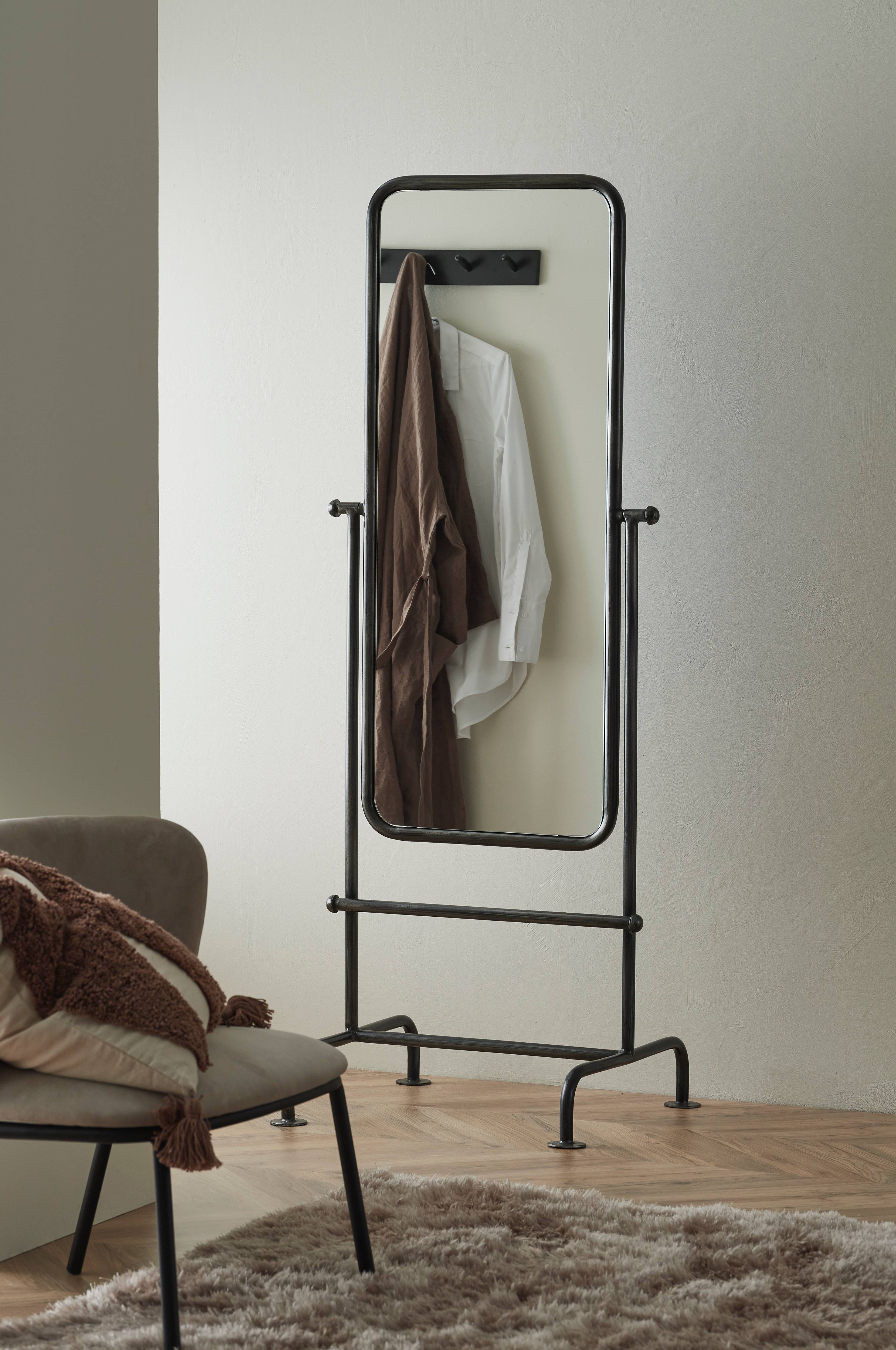 Gulvspejl i industriel stil med stativ og ramme af stål. Spejlet kan vinkles trinløst og skrues fast i den ønske position med en knop på hver side. Spejlglasset sidder på en sort MDF-plade. Spejlglassets mål 43x111 cm.Leveres usamlet.