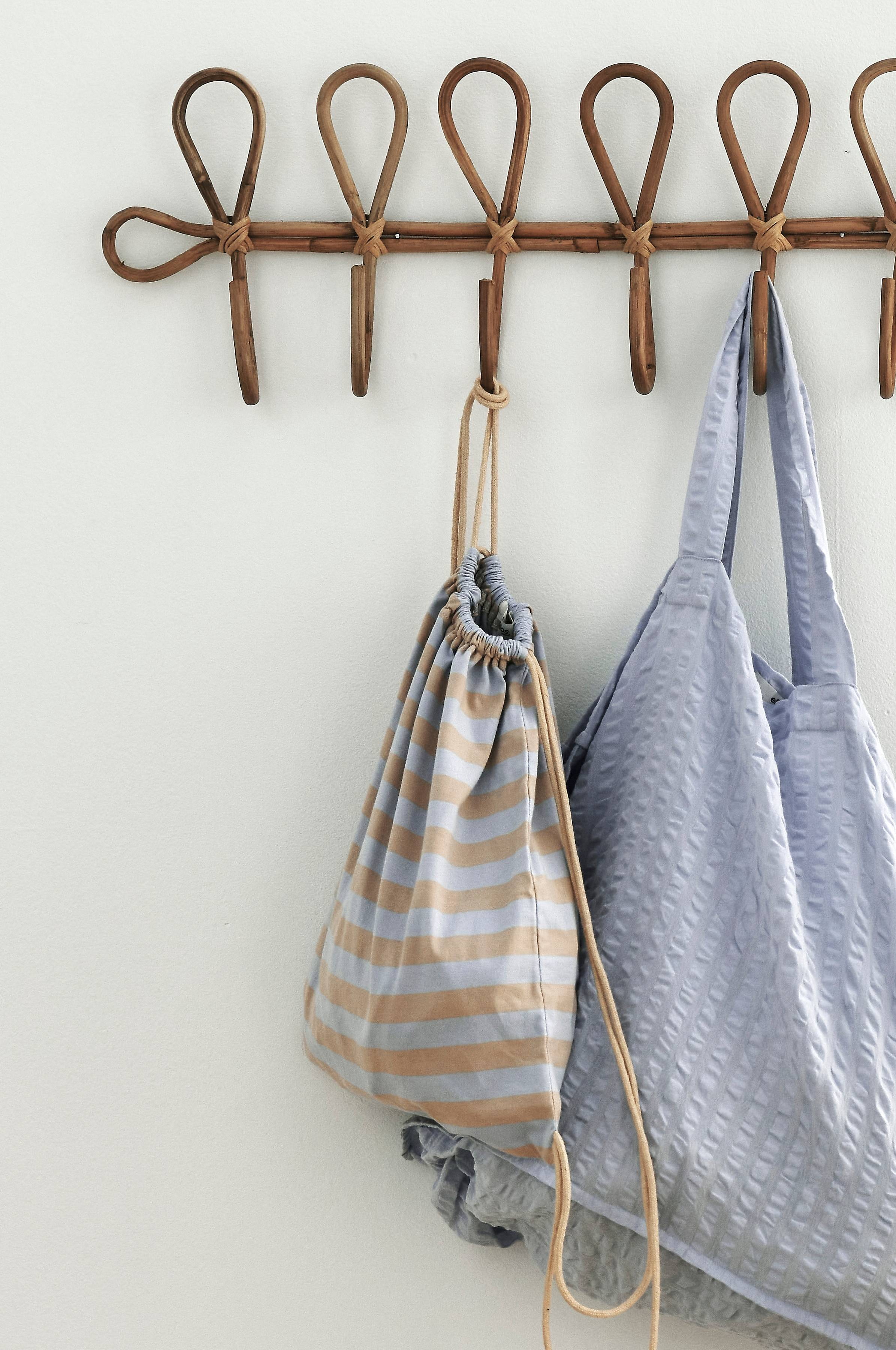 Gymbag i blød, kraftig jersey af økologisk bomuld med vandrette striber. Snørelukning med snor i matchende farve. Mål: B37,5 cm x H 43 cm.