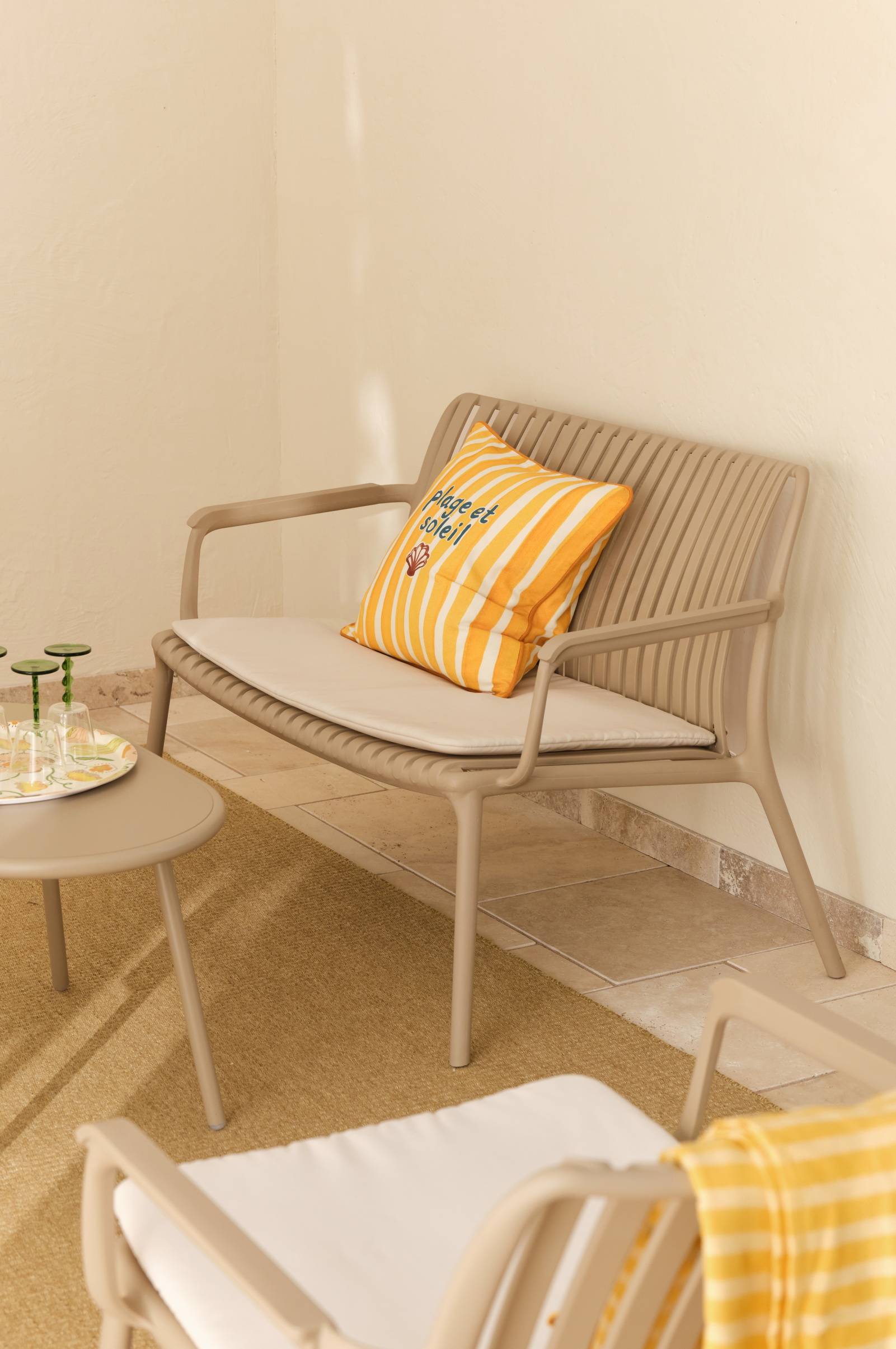 • Sofa med skelet og ben i vejrbestandig polypropylen• Inklusiv sædepude med polstring i polyester og Skumfyld• Ribbet rygstøtte