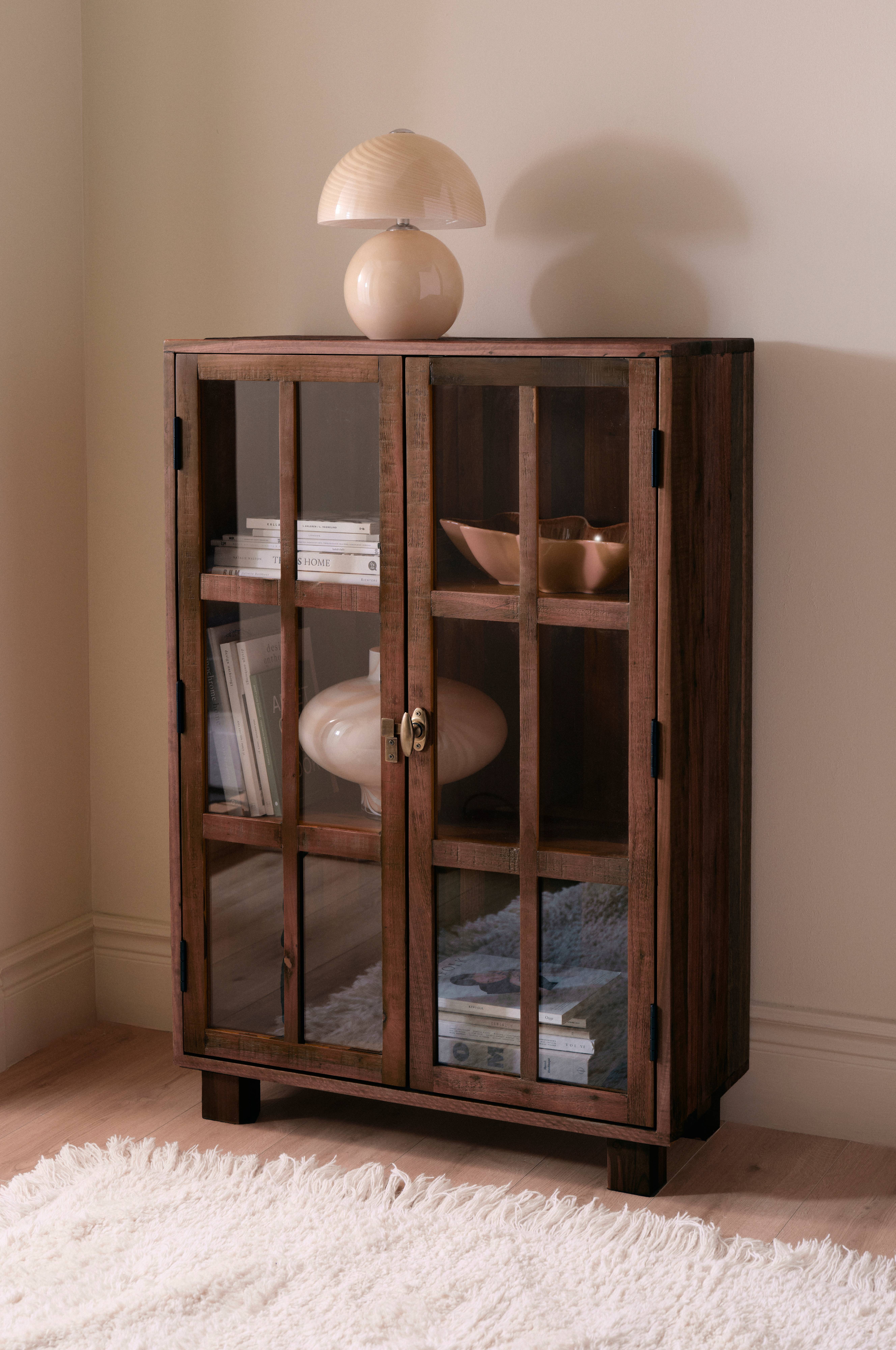 • Højt skab i akacietræ med døre i glas• Messingknap på dørene• Tre faste hylder• Hjul på undersiden for nem flytning• Afstand mellem hylder: 34 cm• Fri højde under møbler: 9 cm