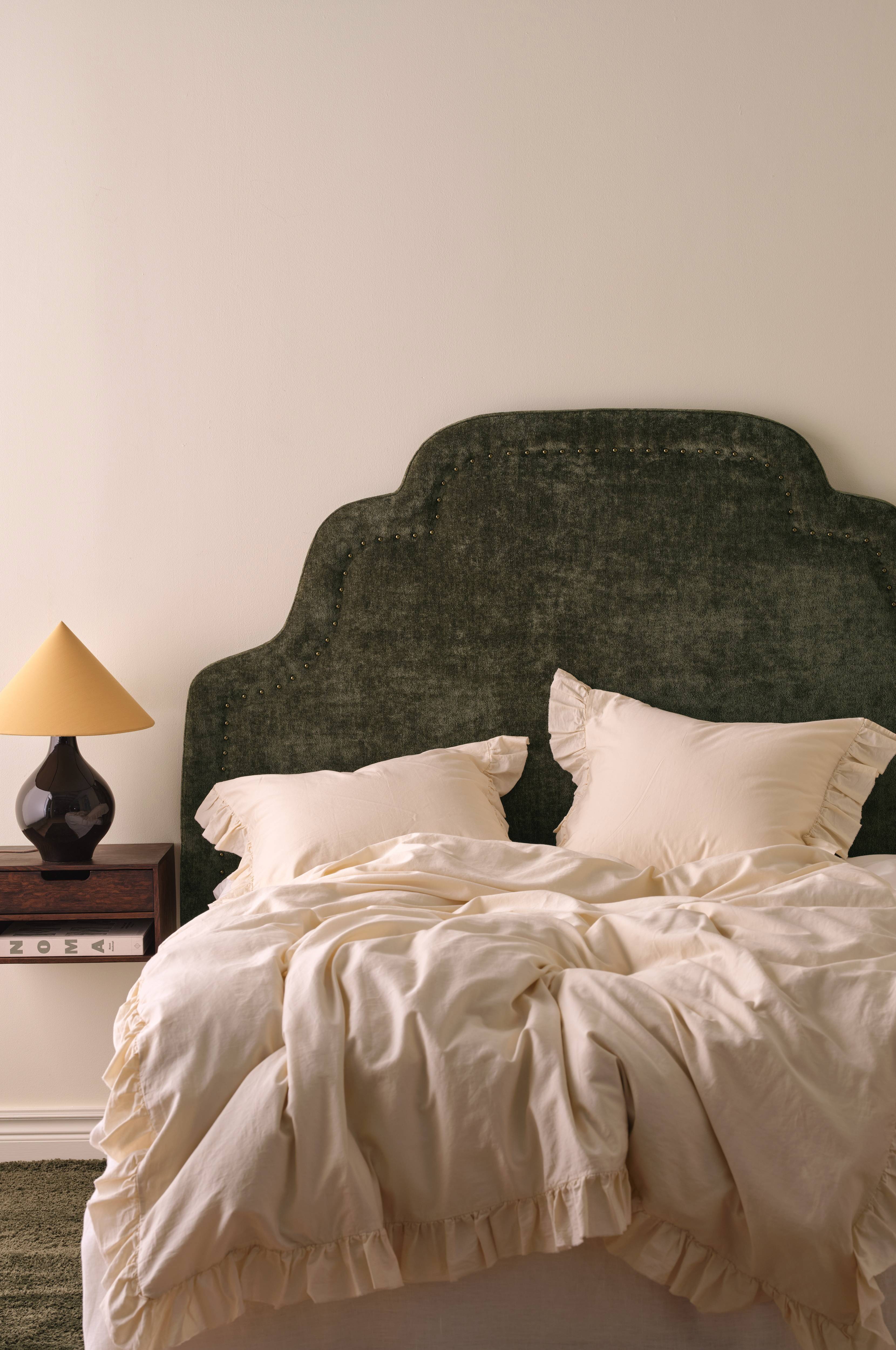 • Hovedgærde med polstring i chenille• Dekorativ passepoilkant hele vejen rundt• Dekorative nitter hele vejen rundt• Skelet i krydsfiner og massivt træ• Skumfyld