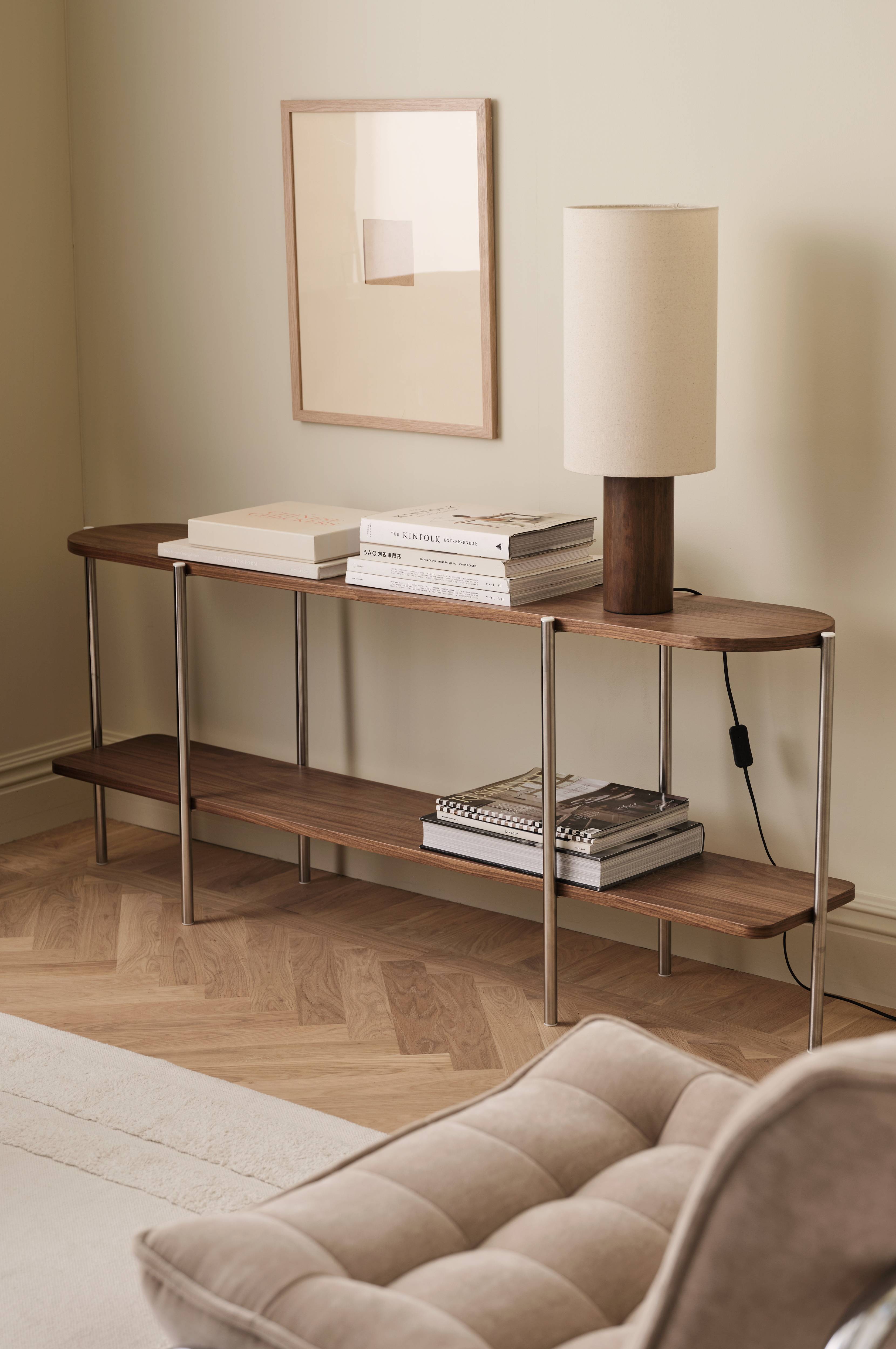 • Hylde med skelet i forkromet metal• To hylder i MDF og valnøddefinér• Vægbeslager• Den øverste hylde er afrundet, og den nederste har lige kanter.• Højde mellem hylderne 37 cm