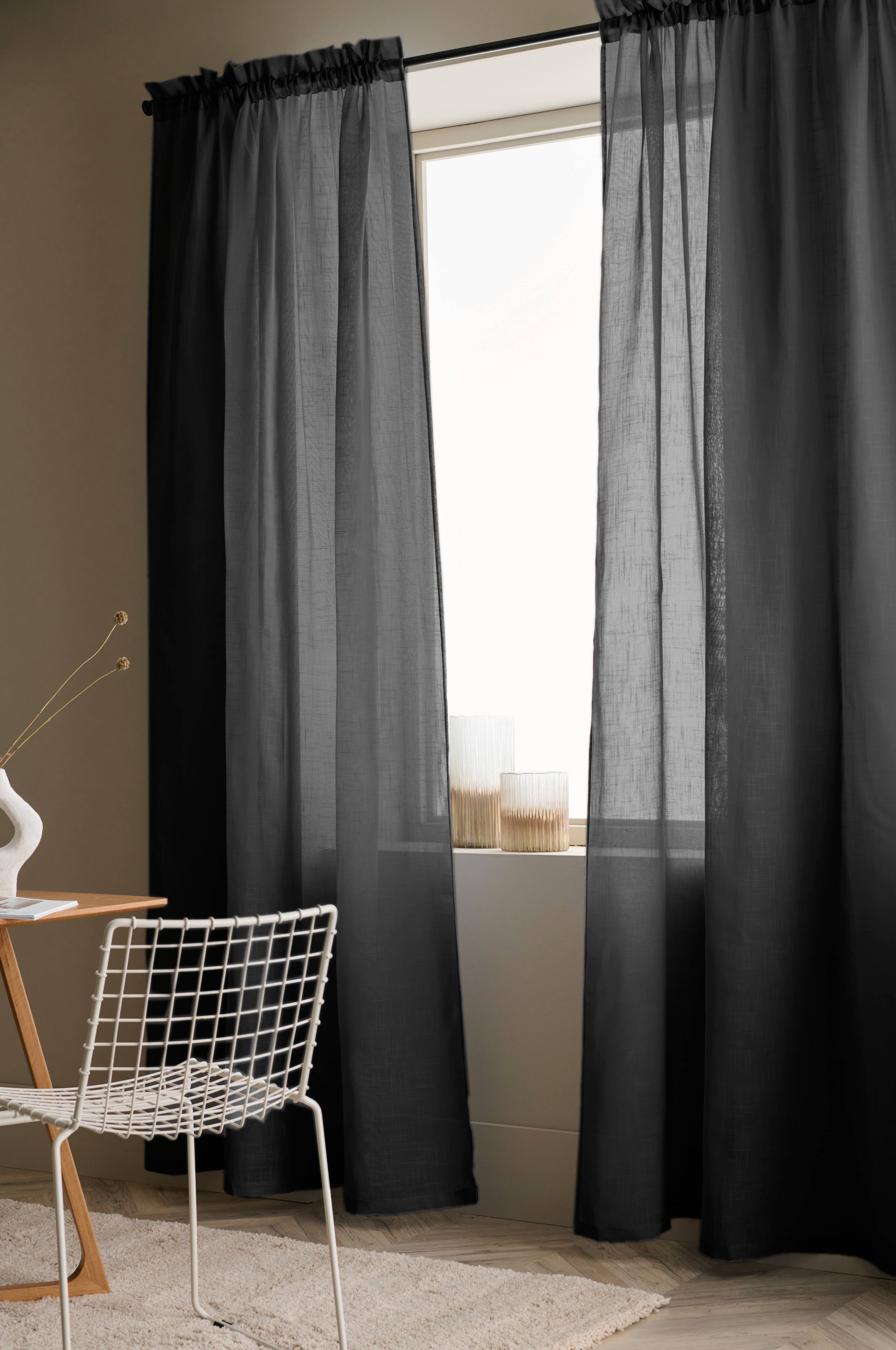 To gardinlængder med løbegang af luftig polyester med struktur i hørlook. 5 cm rynkekant. Bredde 134 cm. To længder: 220 og 250 cm.