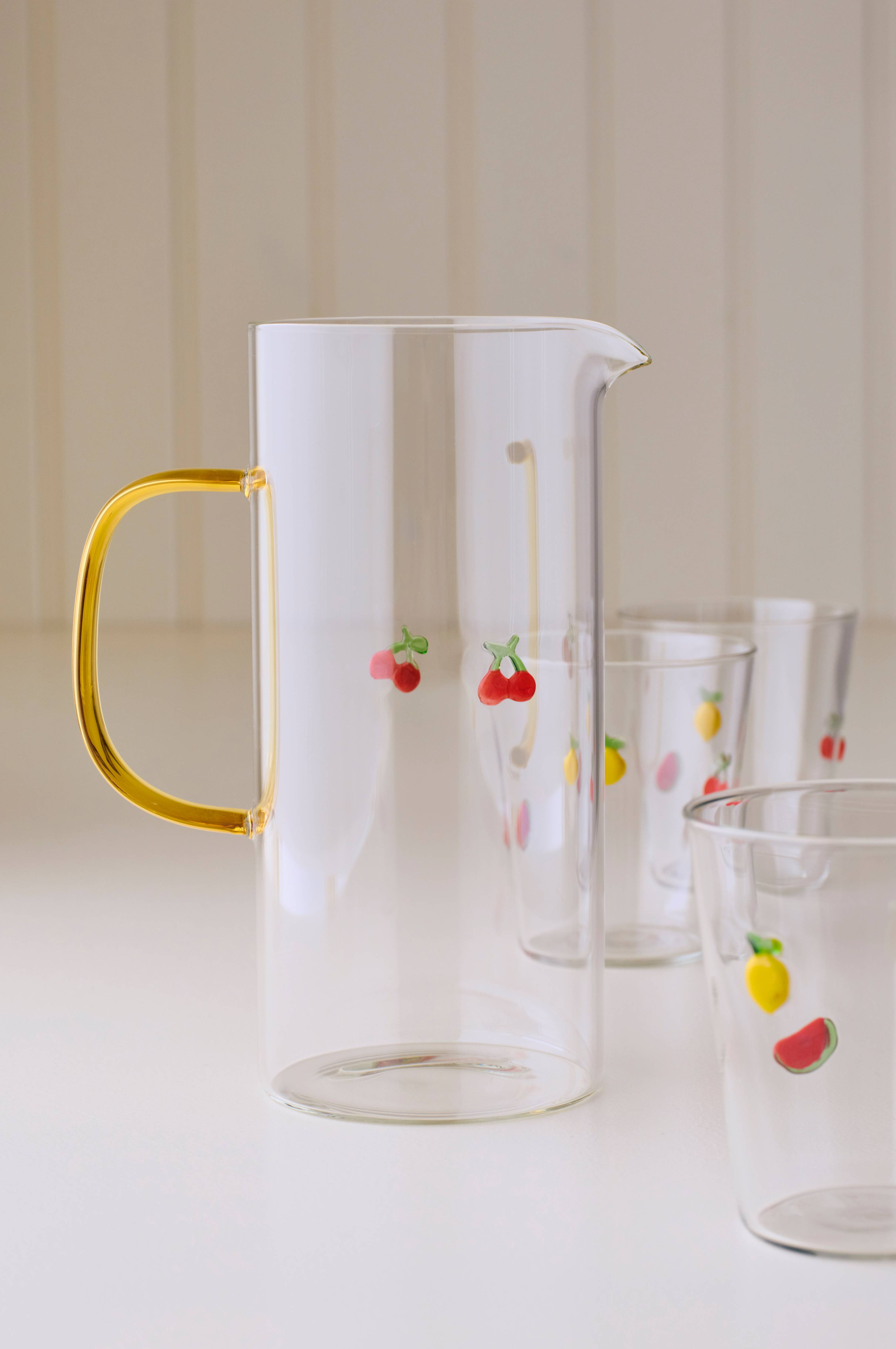 • Karaffel i klart glas• Håndtag i farvet glas• Dekorative frugtmotiver