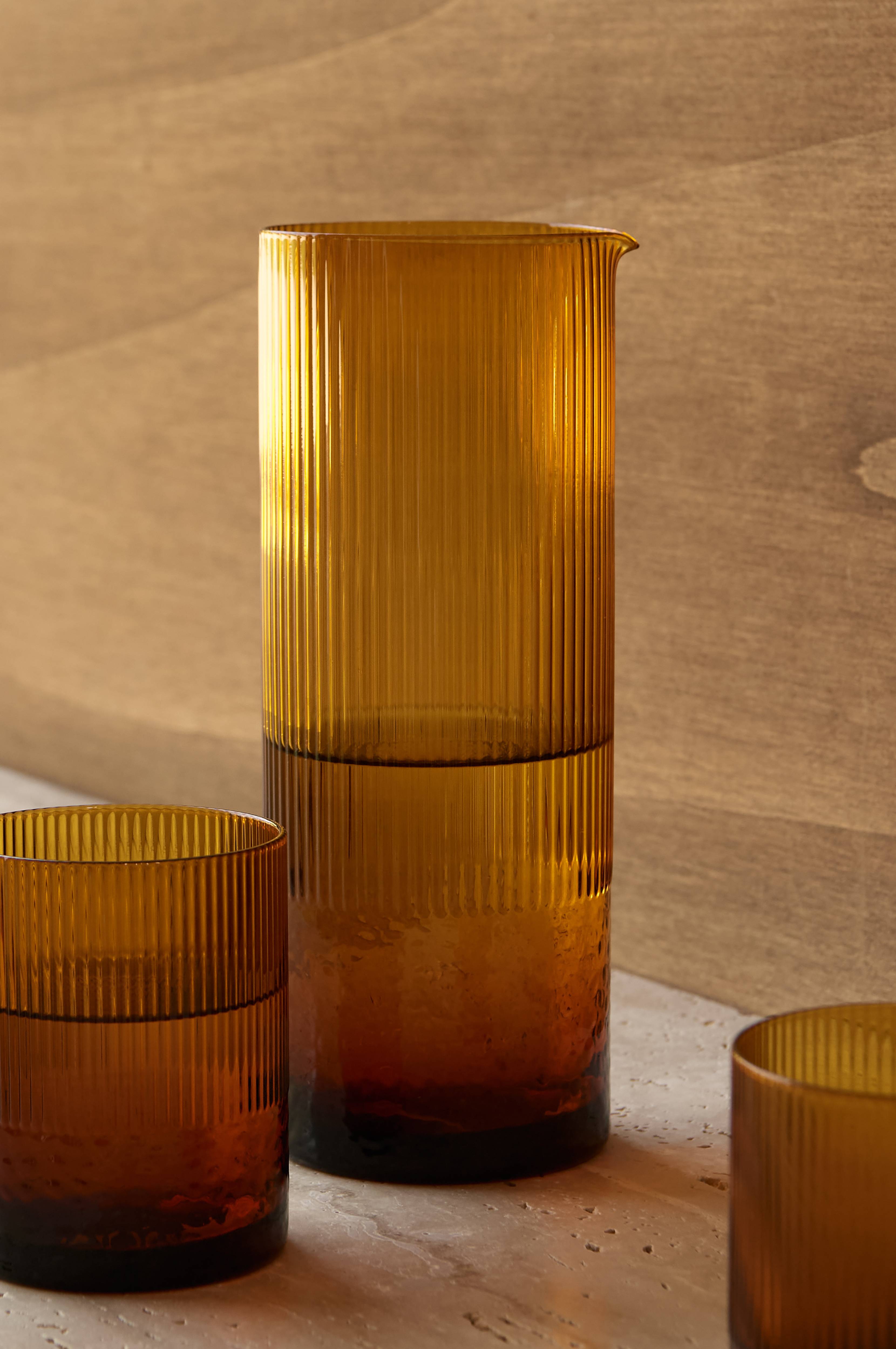 Karaffel med riflet overflade foroven og dekorativ struktur forneden. Volumen: 1250 ml.Tåler opvaskemaskine men ikke mikrobølgeovn.