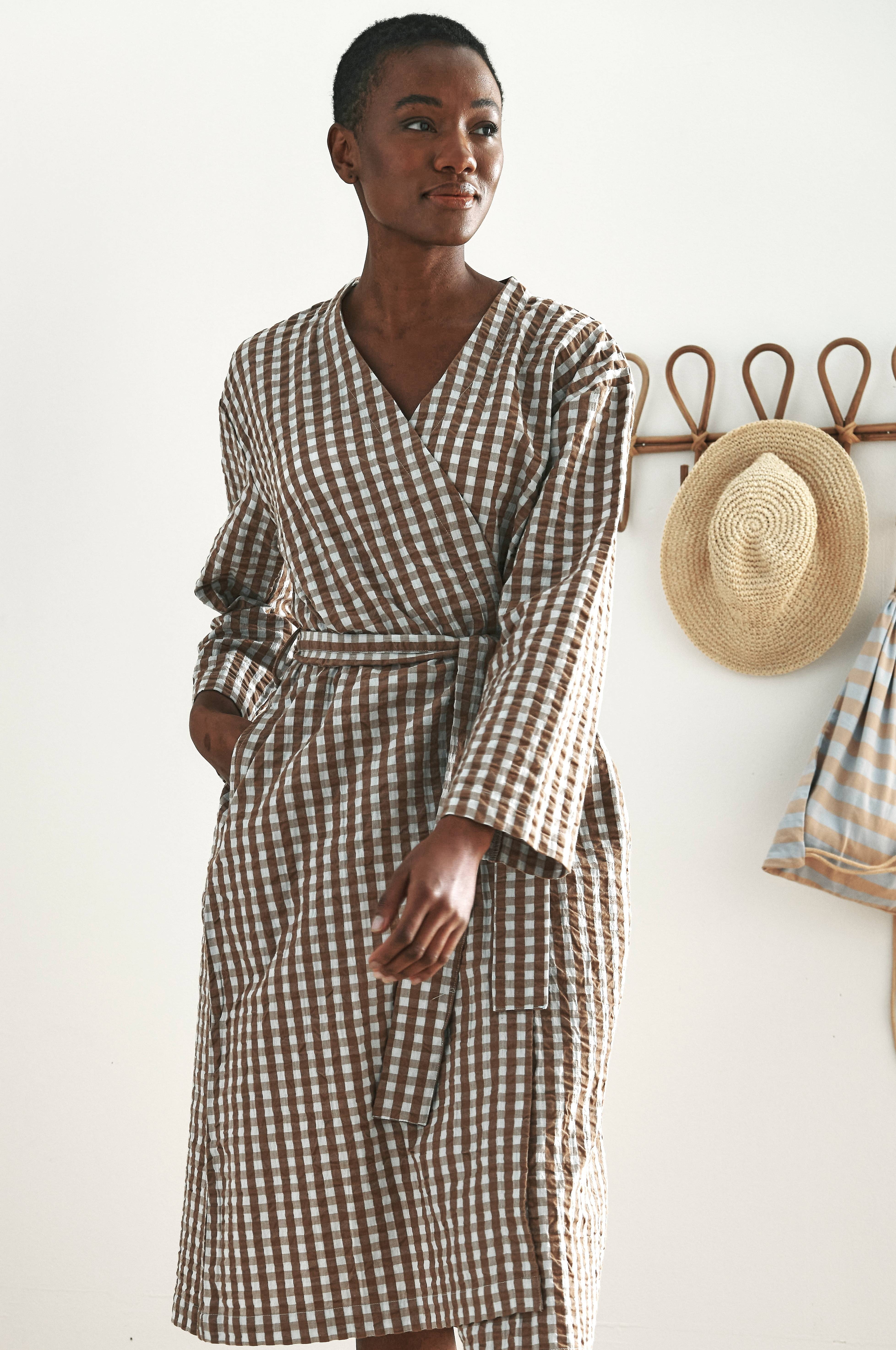 Kimono i seersucker (bæk og bølge) af økologisk bomuld. Lang model med afslappet pasform. Aftageligt bindebælte og to lommer.
