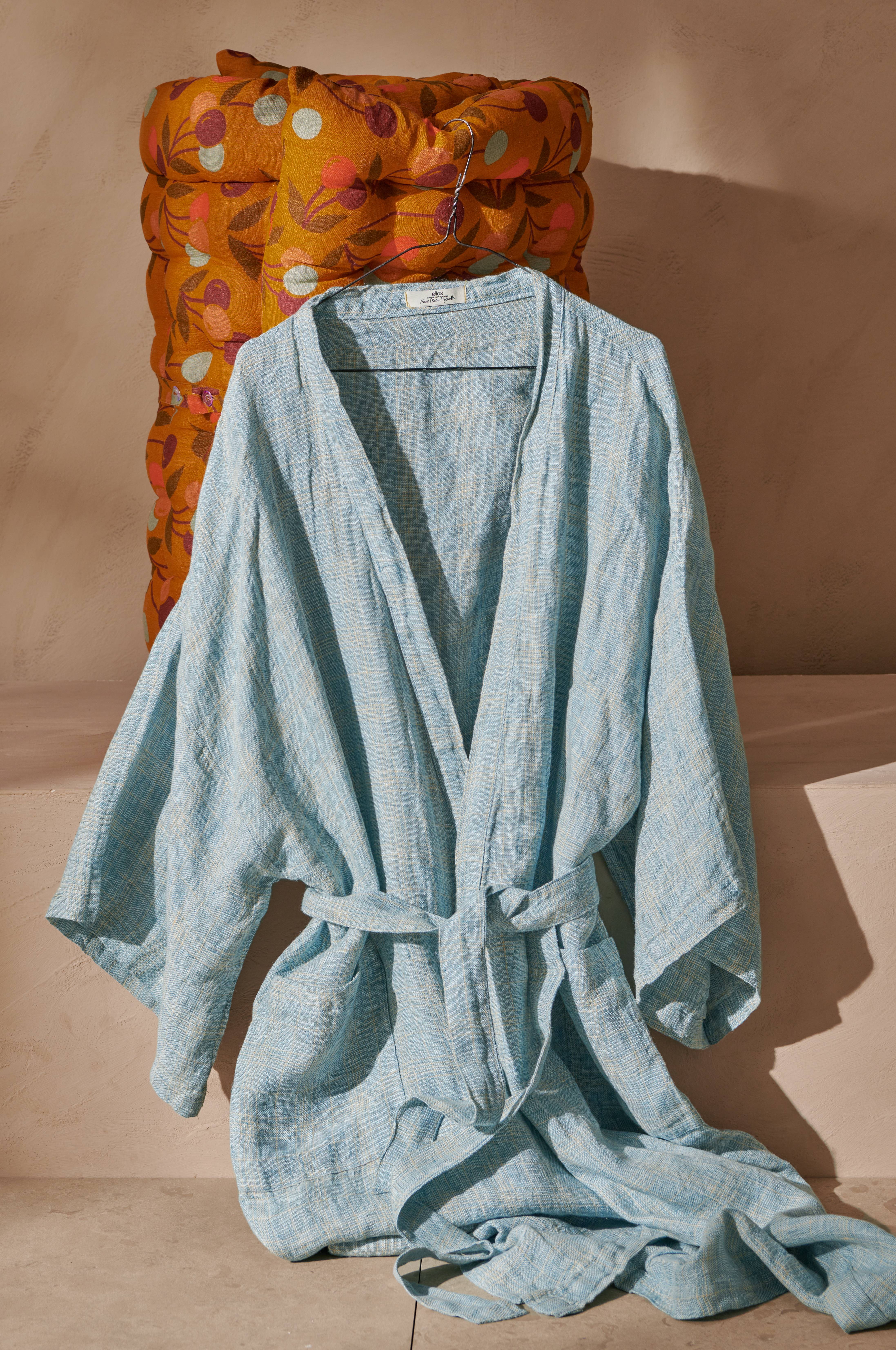 Kimono i kølig, blød hørkvalitet. Vide ærmer og aftageligt bindebælte. To udvendige lommer. Leveres i stofpose i samme kvalitet.