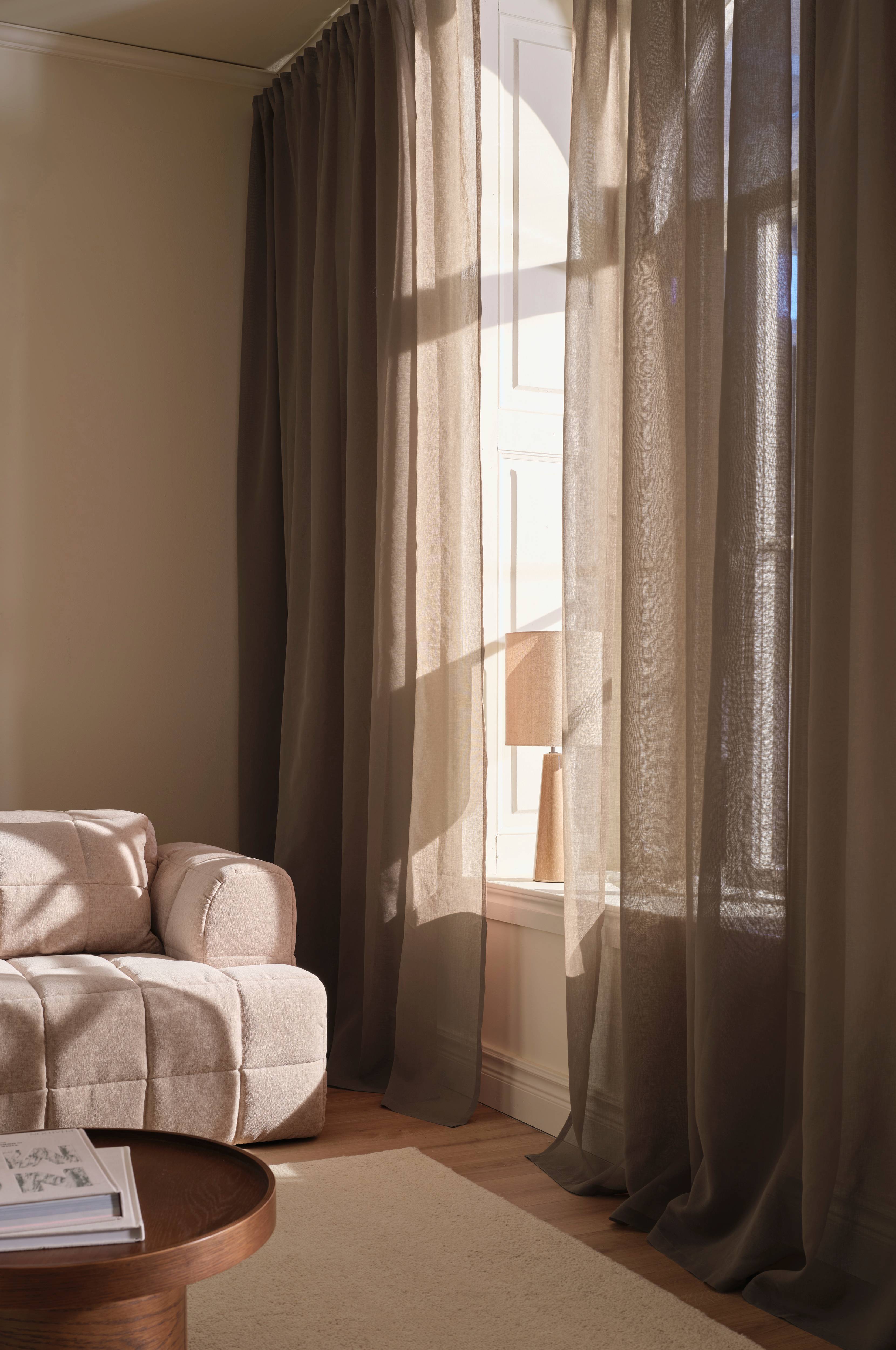 KIRA er et dejligt gennemsigtigt gardin med en smuk, lidt mere sparsom vævning. Lyset filtreres og falder blødt ind i rummet, og hvis du vil skærme for solens stråler eller begrænse gennemsigtigheden, kan du trække gardinet for og stadig få lyset ind. Gardinet har et let fald, og du kan kombinere det med et tungere mørklægningsgardin for at få en luksuriøs hotelfornemmelse. Det bløde farveskema passer godt til stoffets fornemmelse. KIRA-gardinet er fremstillet af certificeret genbrugspolyester. Længderne har påsyet, transparent multifunktionelt bånd i toppen, og det kan hænges op med fingerkroge, en kanal og en skjult bøjle.