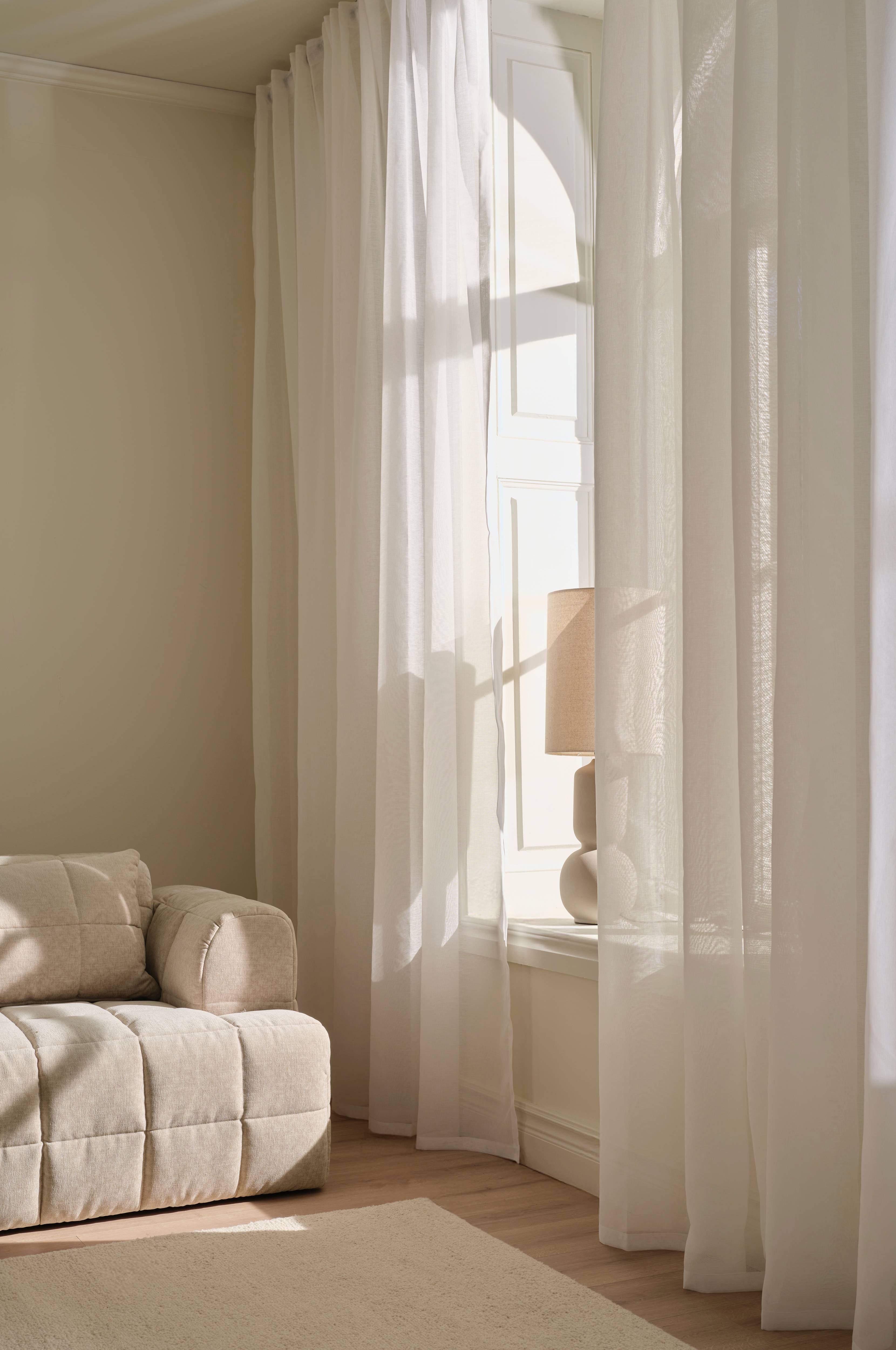 KIRA er et dejligt gennemsigtigt gardin med en smuk, lidt mere sparsom vævning. Lyset filtreres og falder blødt ind i rummet, og hvis du vil skærme for solens stråler eller begrænse gennemsigtigheden, kan du trække gardinet for og stadig få lyset ind. Gardinet har et let fald, og du kan kombinere det med et tungere mørklægningsgardin for at få en luksuriøs hotelfornemmelse. Det bløde farveskema passer godt til stoffets fornemmelse. KIRA-gardinet er fremstillet af certificeret genbrugspolyester. Længderne har påsyet, transparent multifunktionelt bånd i toppen, og det kan hænges op med fingerkroge, en kanal og en skjult bøjle.