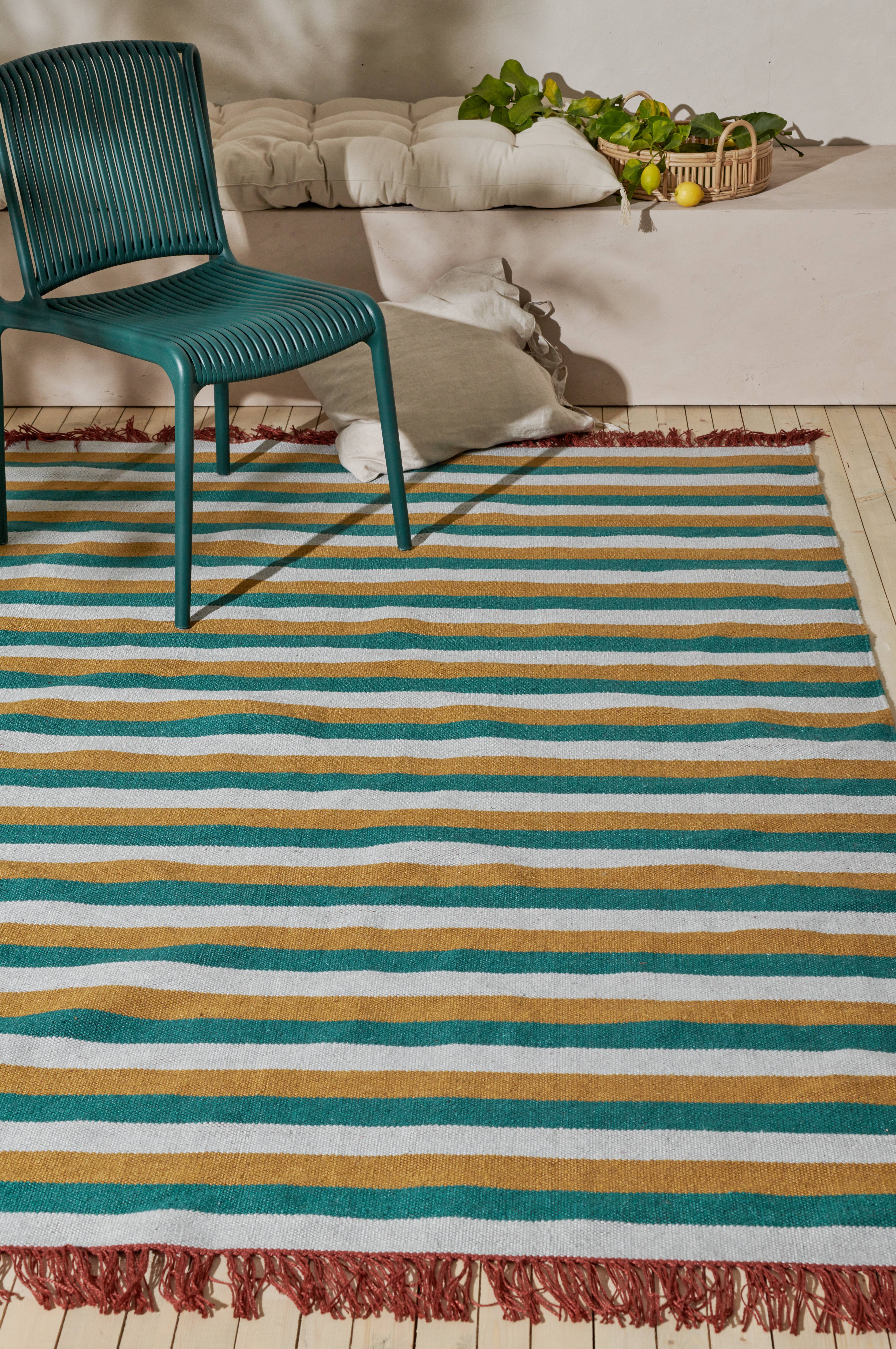 Vævet kludetæppe i genindvundet polyester med frynser i enderne. Tæppet kan også bruges udendørs, f.eks. på balkonen eller altanen.