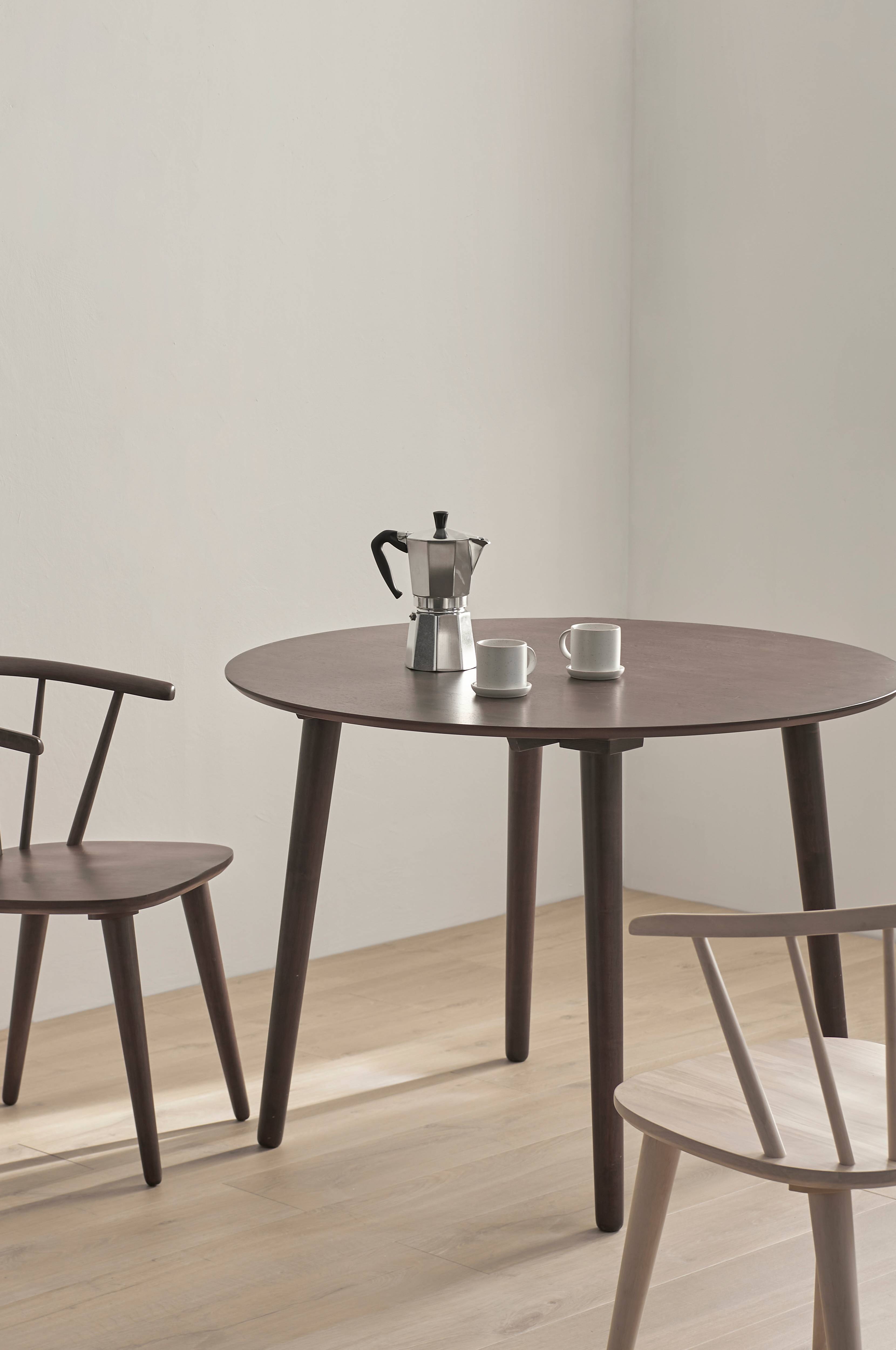 Bord med plade i askefinéret MDF og ben og stel i massivt gummitræ. Ø 106 cm. Højde 76 cm. Bordpladetykkelse ca. 2 cm. Leveres samlet (kun skrue på benene ved levering). Vægt 22 kg.