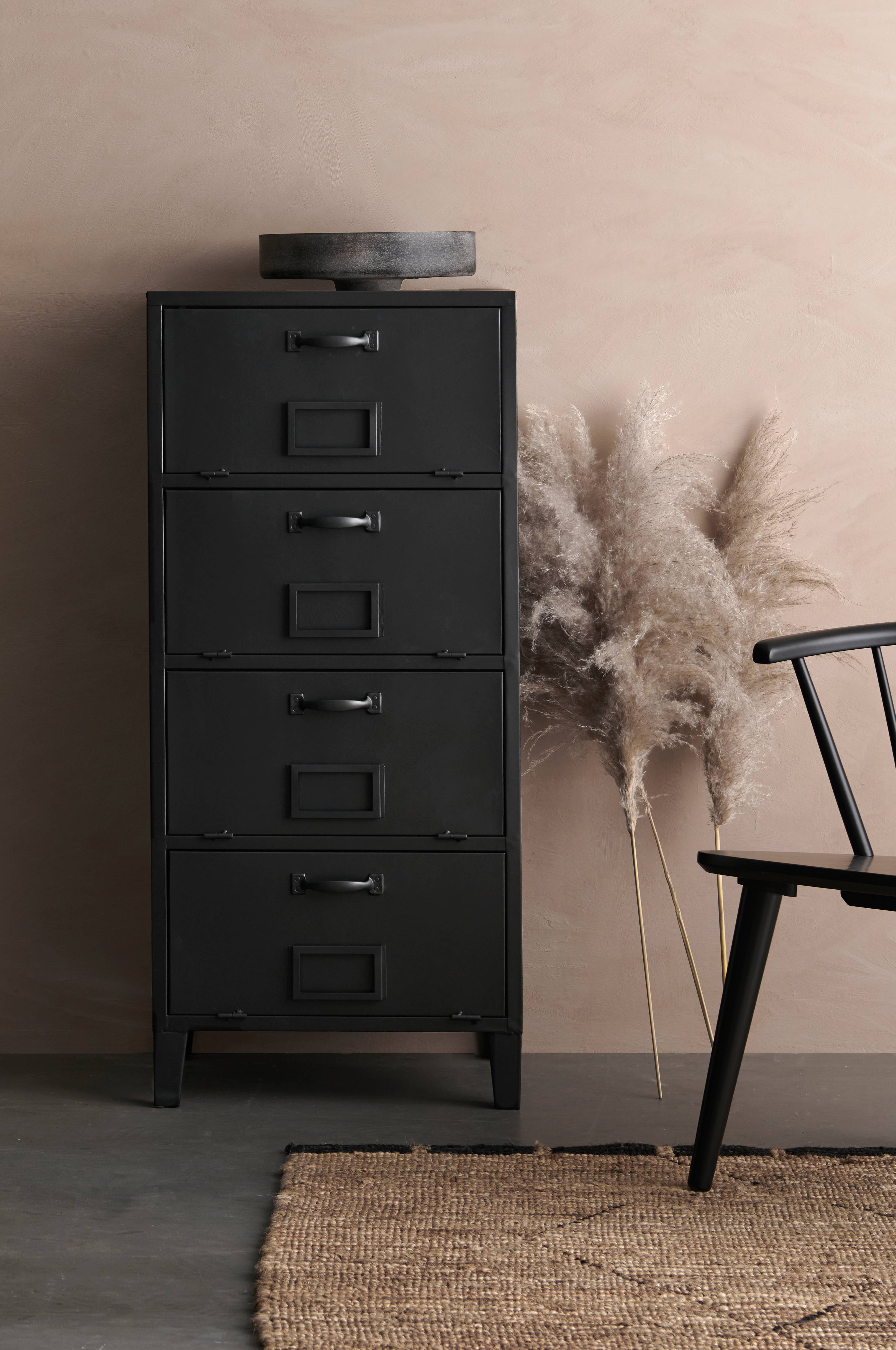 Kommode i industrielt look. Af metal med 4 rum og låger. Etiketholder på lågerne. Højde 110 cm. Bredde 50 cm. Dybde 35 cm. Mål på rum 46x20 cm, dybde 33 cm. Samlet.